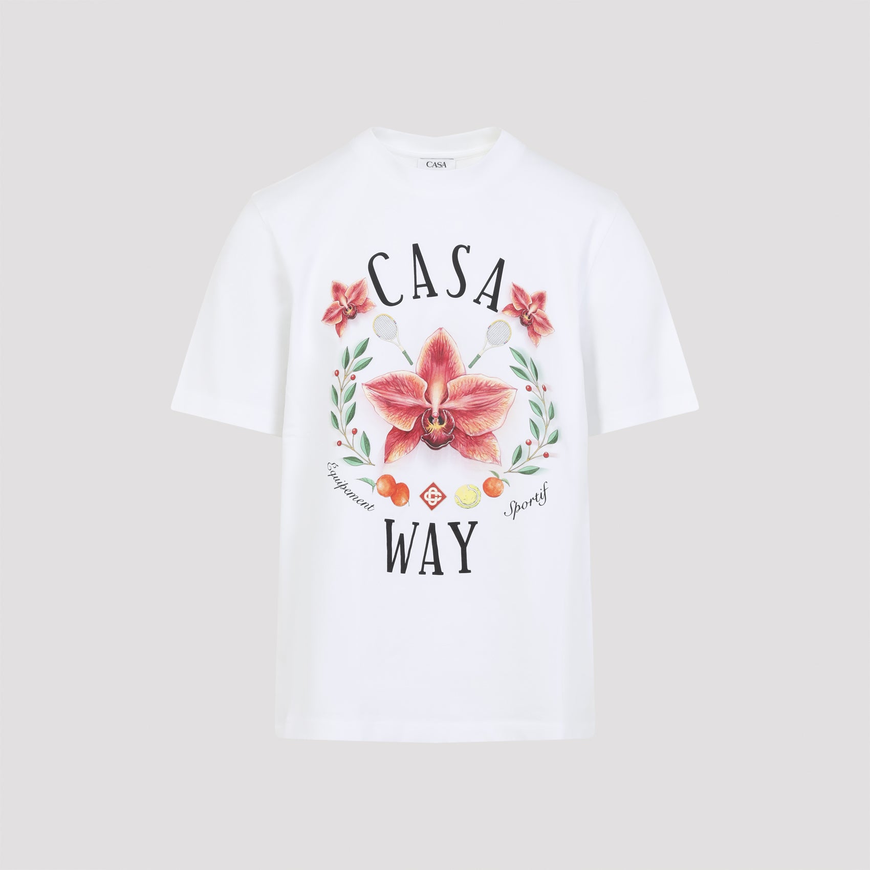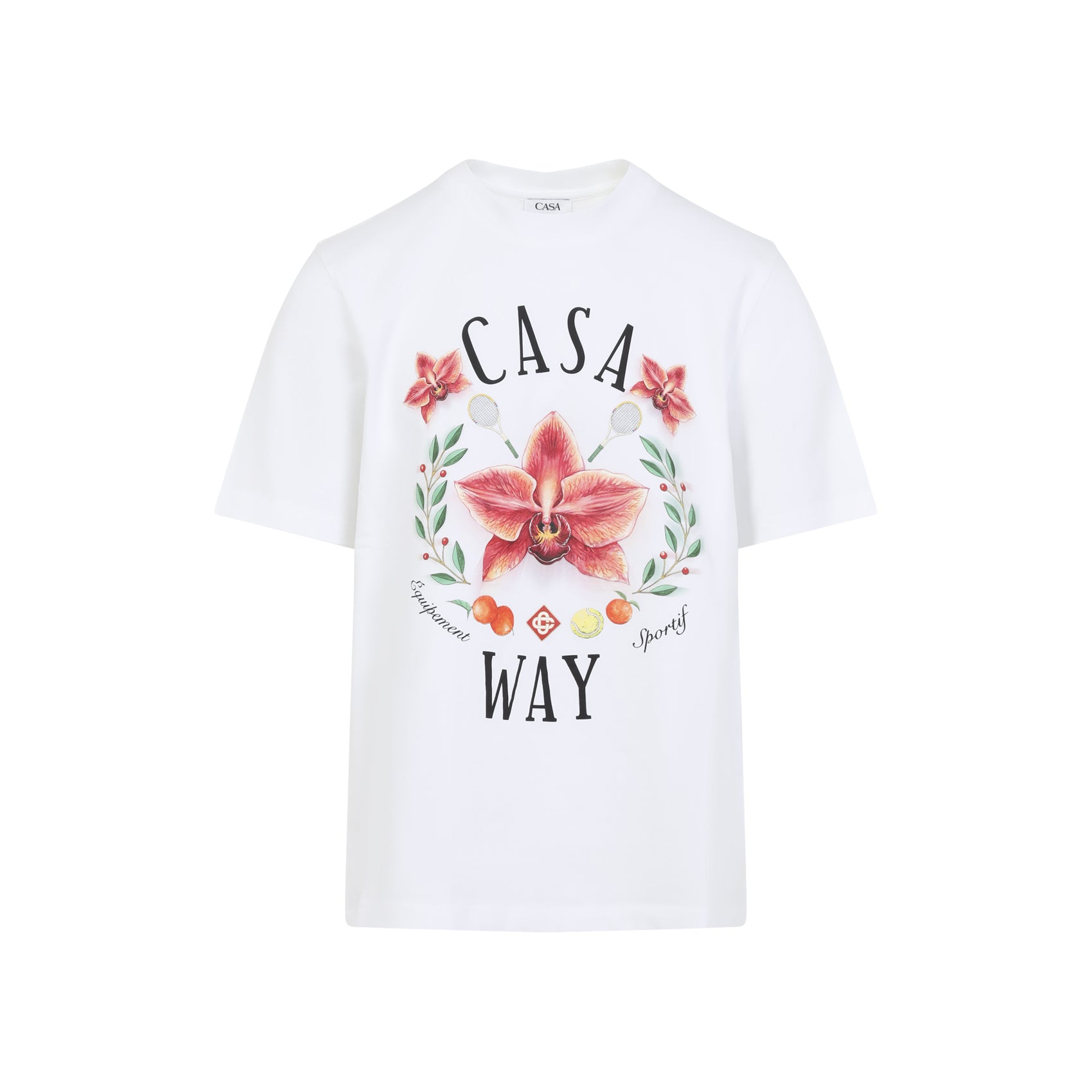 Casablanca Casa Way White Cotton T-shirt. Crafted from white cotton jersey, it features a round ribbed neckline, logo and Casa Way graphic print on the front, short sleeves, and a straight hem