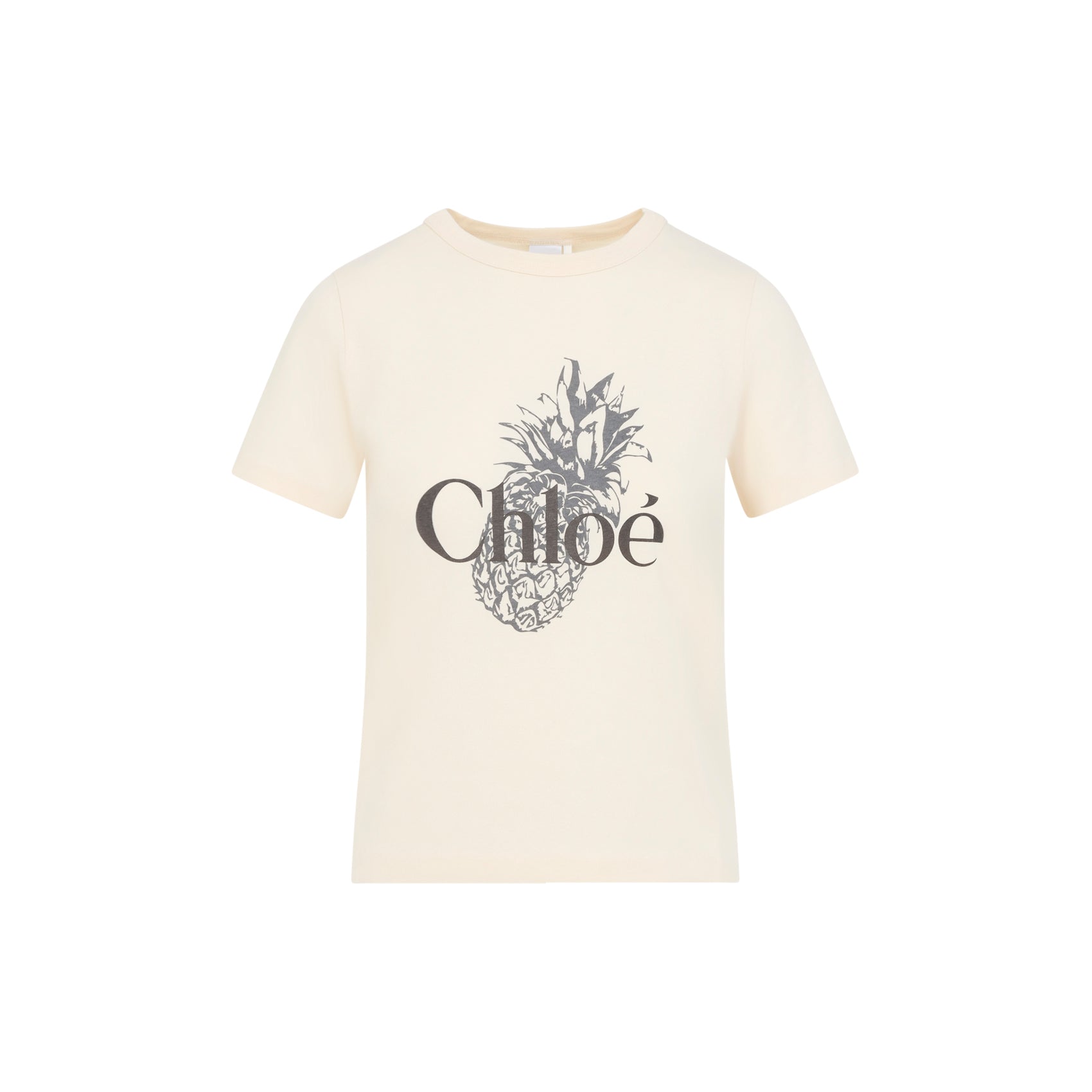 Chloe Tender Peach Beige Cotton T-Shirt. Pure tender peach beige cotton t-shirt, round neck, front contrasting grey design, short sleeves, straight hem, tonal stitching.