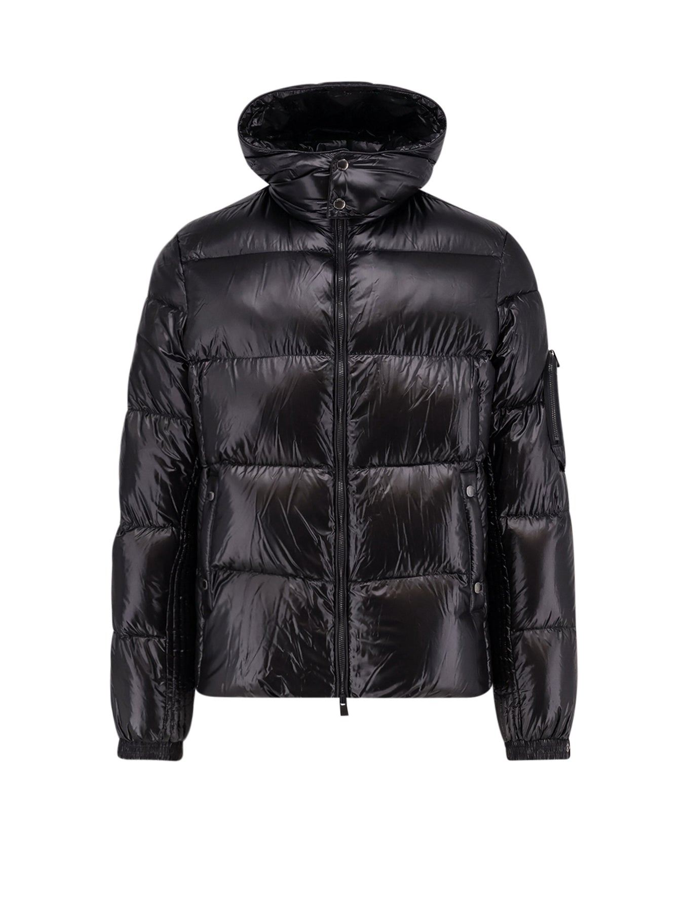 Zip closure with two-way slider Removable hood with adjustable drawstring Front pockets with double snap closure Zippered pocket with logo patch on the left sleeve 100% nylon Filling: 90% down, 10% feather SKU: MJXA0001013588001