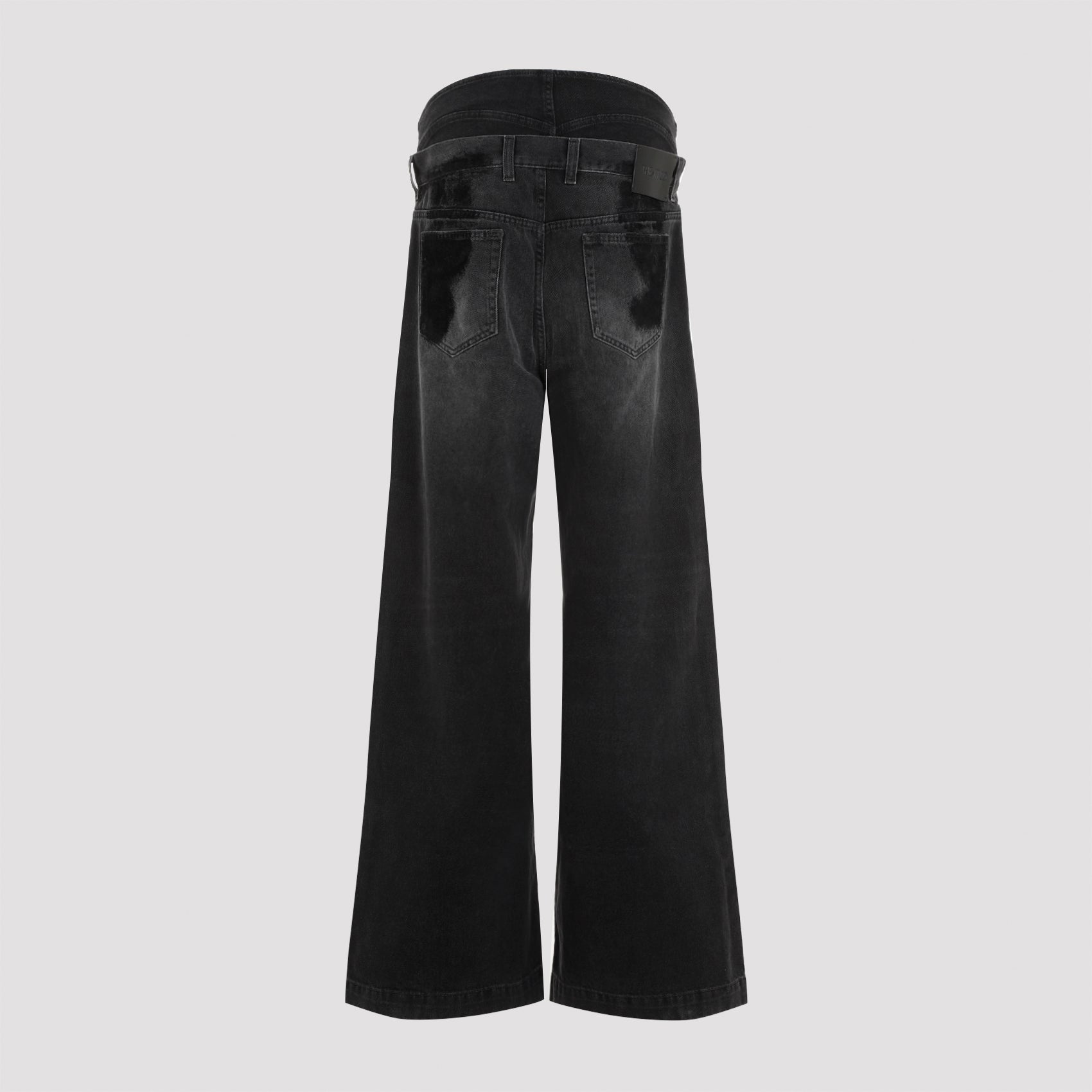 The Attico Black Cotton Jeans. Black cotton denim, used effect, mid-rise, tonal boxer effect detail, branded button on the waist, belt loops, front button and zip closure, 5-pockets design, front pleated mini pocket, tonal branded label at the back waist, full length, wide leg.