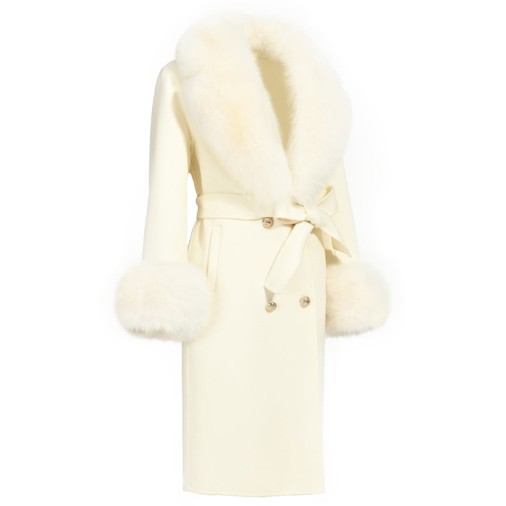 Wanan Touch cappotto in cachemire, modello con dettagli in pelliccia di volpe. Chiusura con bottoni e cintura rimovibile