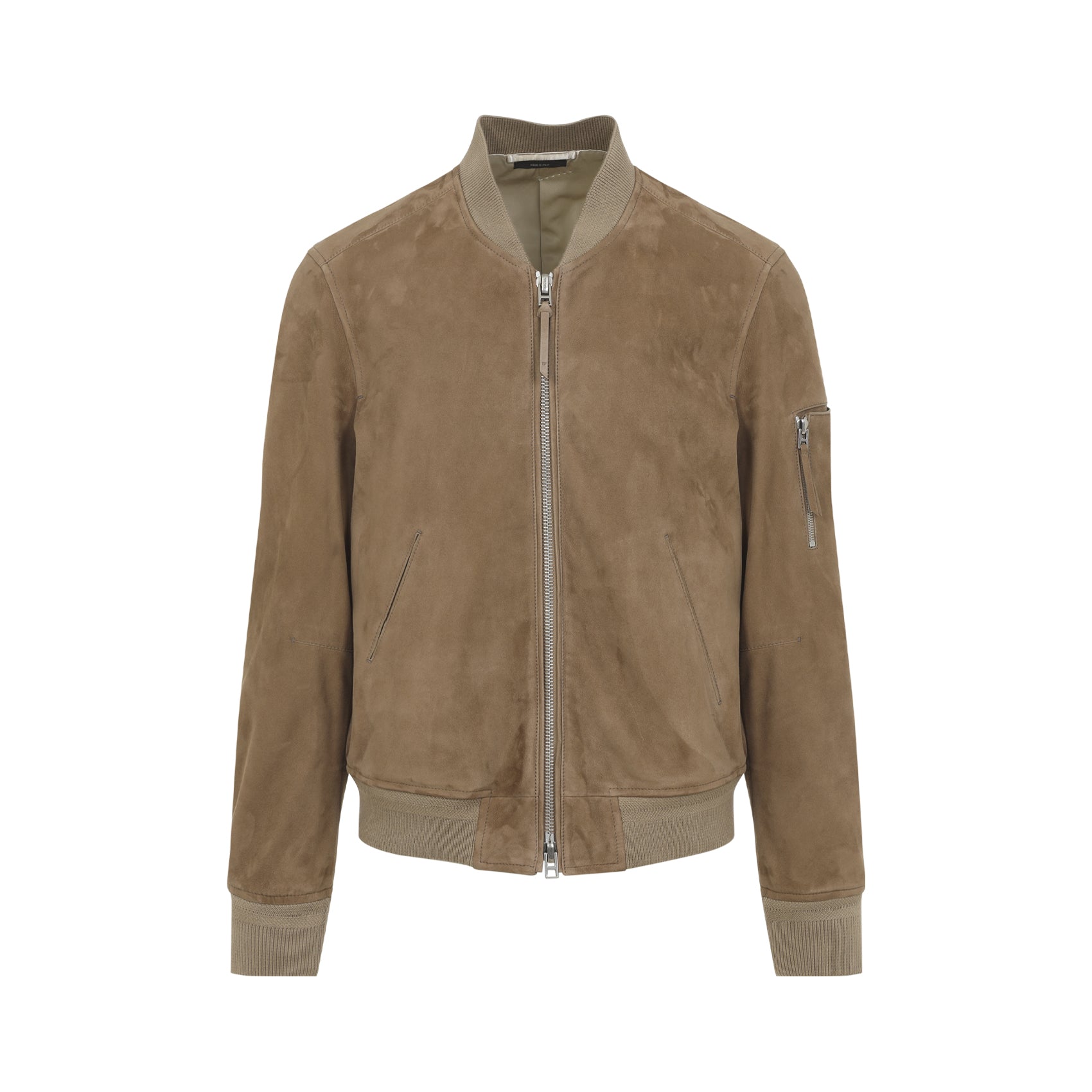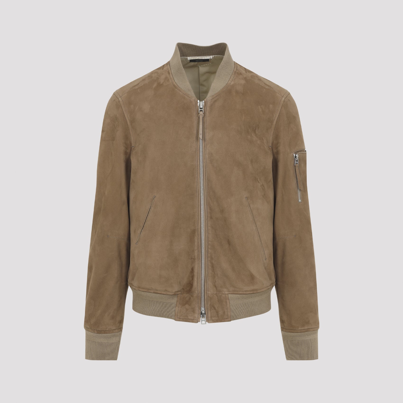 Tom Ford Beige Leather Jacket. Crafted from dark beige suede leather, it features a bomber-style design, a round neckline, a two-way zip fastening, two front pockets, and long sleeves with a small zip pocket on the left sleeve. Finished with ribbed edges and a full lining.