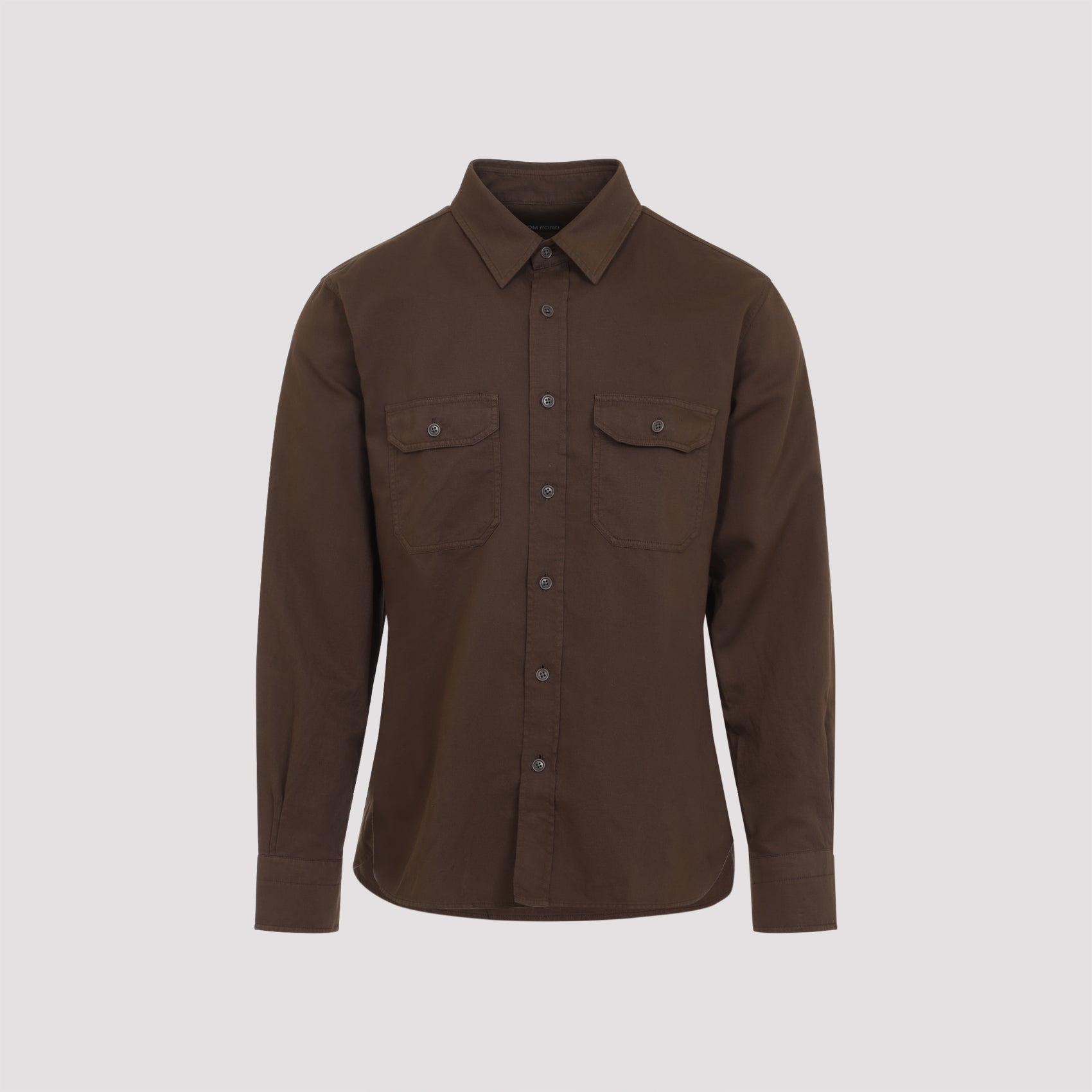 Tom Ford Military Green Cotton Shirt. Crafted from green cotton and linen drill, pointed collar, front button fastening, flap pockets on the chest, long sleeves with buttoned cuffs, back yoke and box pleat, round hem.