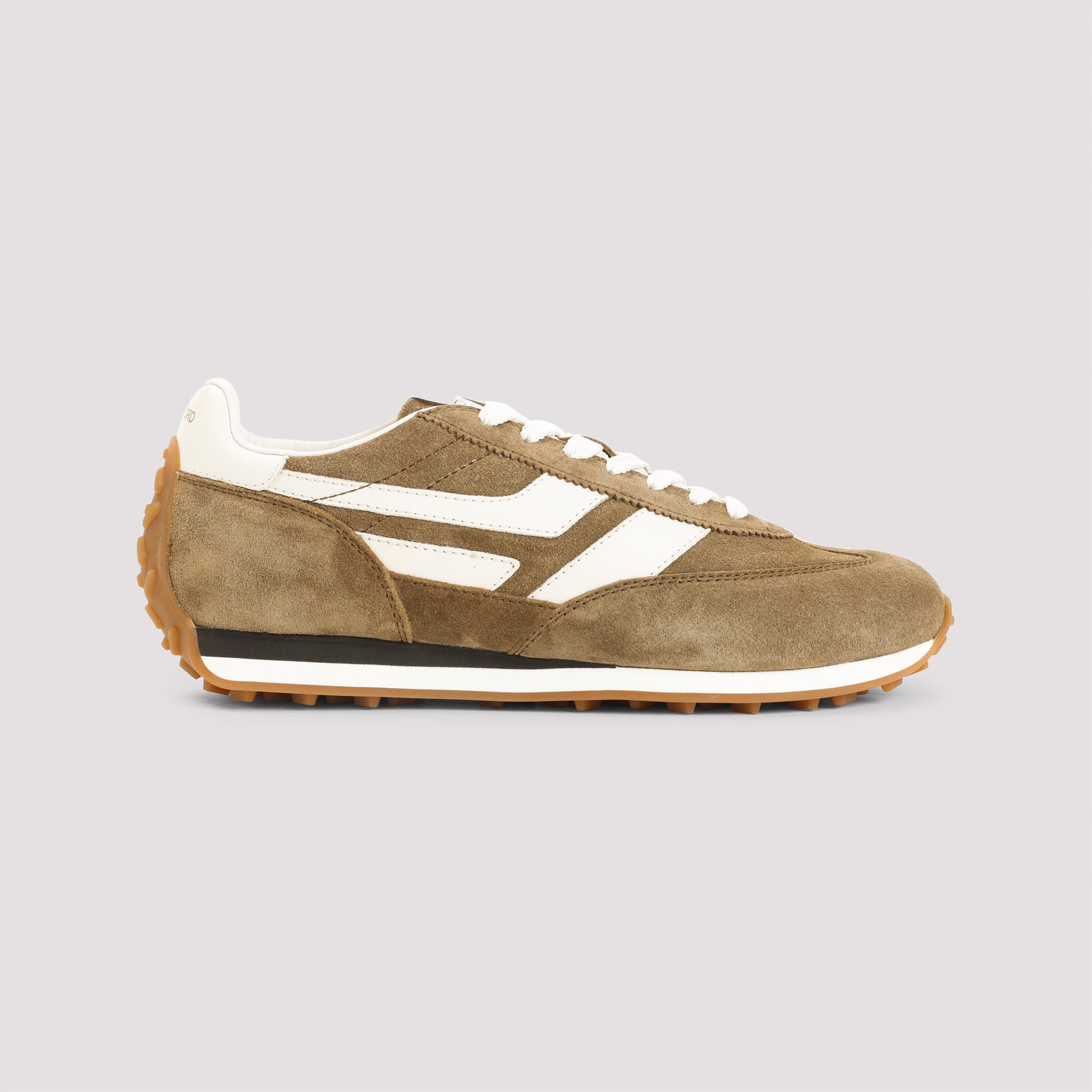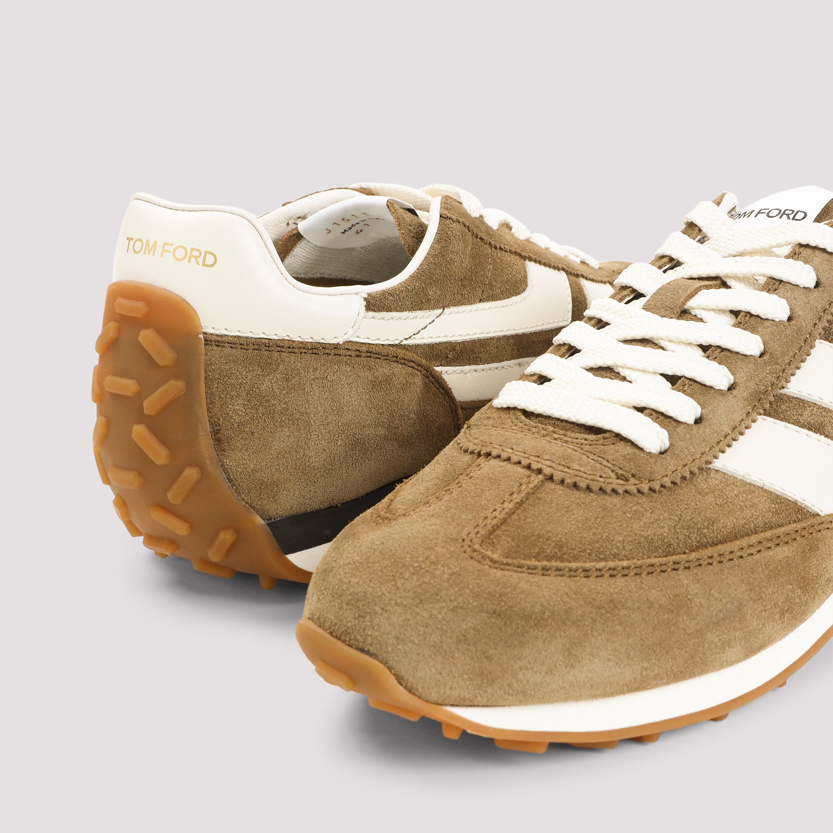 Tom Ford Mick Brown Calf Leather Sneakers. Crafted from light brown suede leather, white leather inserts, round toe, lace-up fastening, branded label on the tongue, stamped logo at the back, leather lining and insole, rubber outsole.