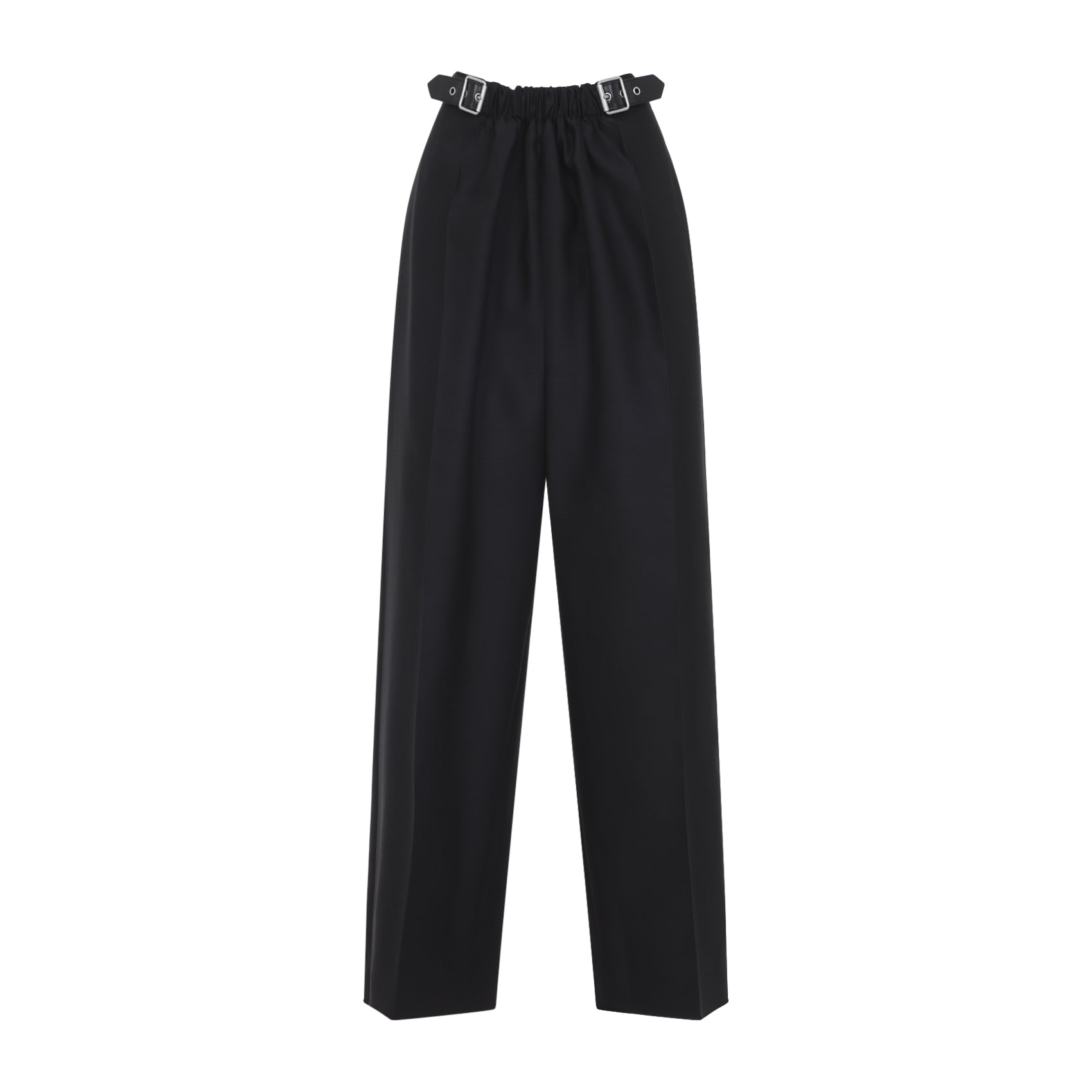 Loewe Belted Black Wool and Silk Trousers. Mid-waisted trousers crafted from black wool and silk, featuring a gathered front with two leather belt details, a concealed side zip fastening, inseam side pockets, a back welt pocket, a branded leather label at the back of the waist, central pressed creases, and a straight leg.