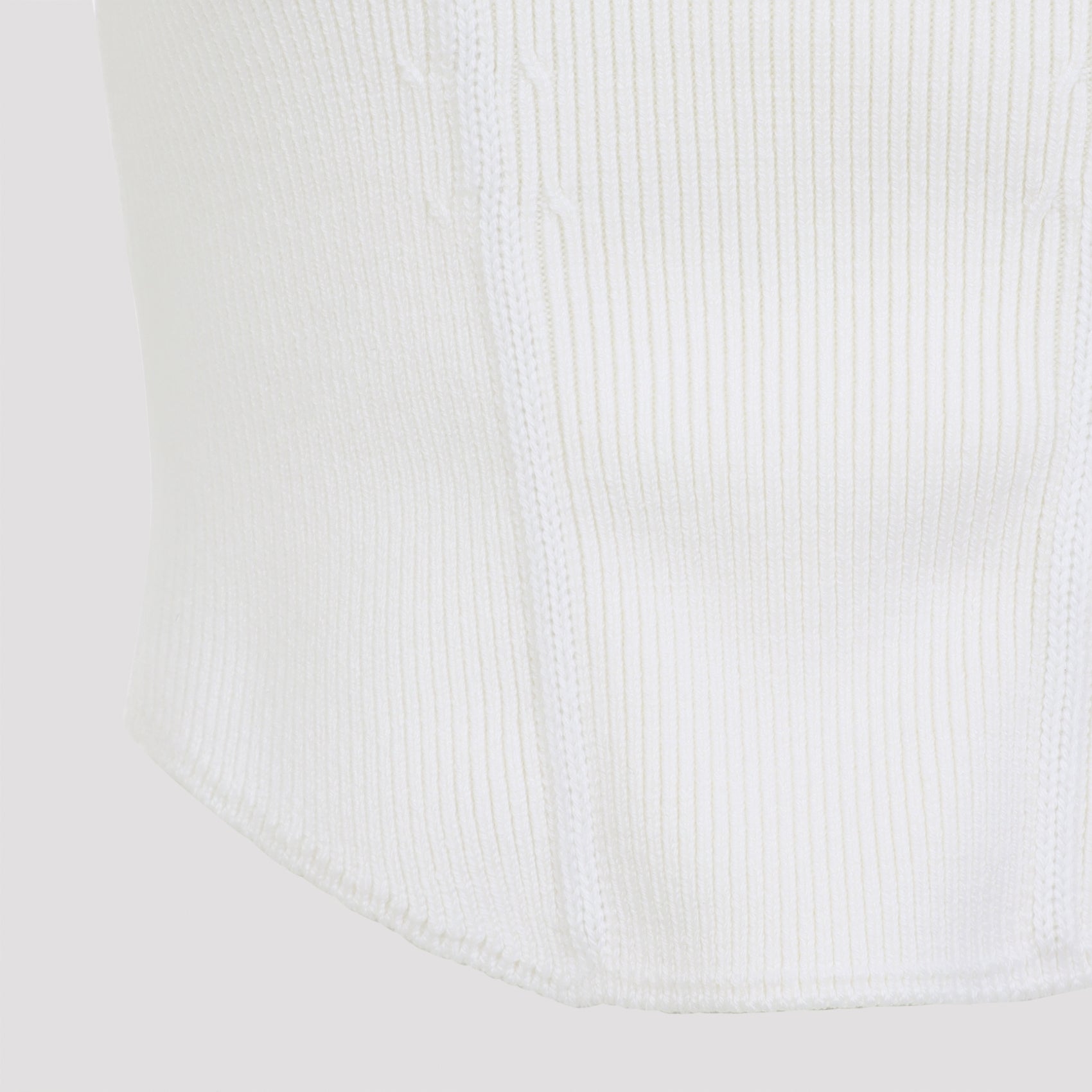 Alaïa Corset White Wool Top. The top featuring a corset design with integrated boning, crafted from white ribbed wool, round neckline, sleeveless design, curved hemline.
