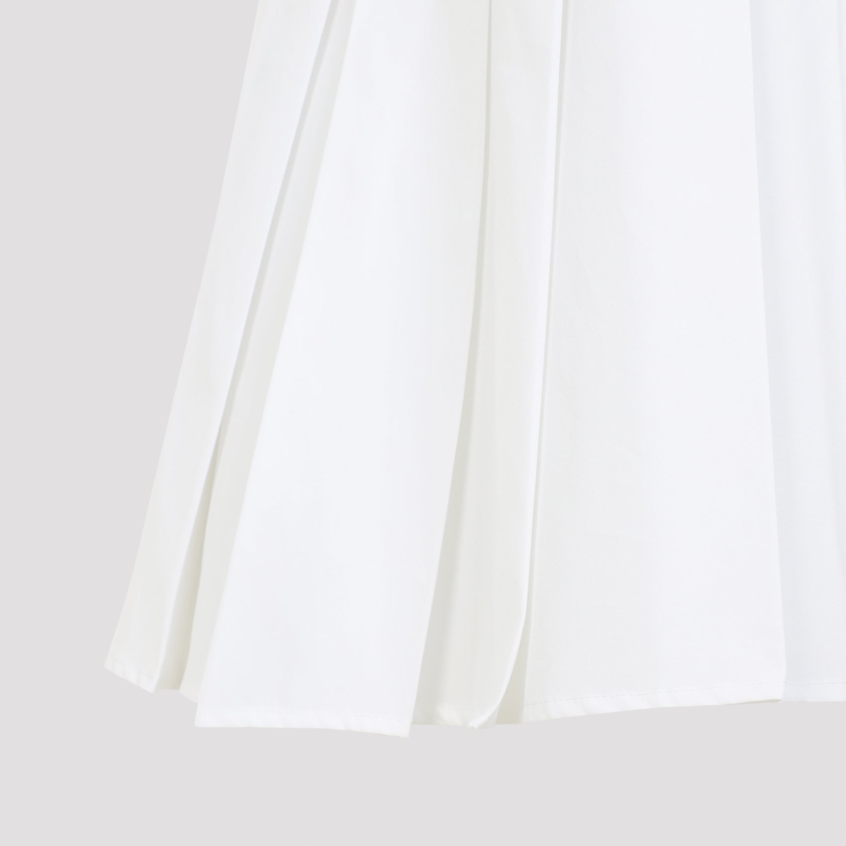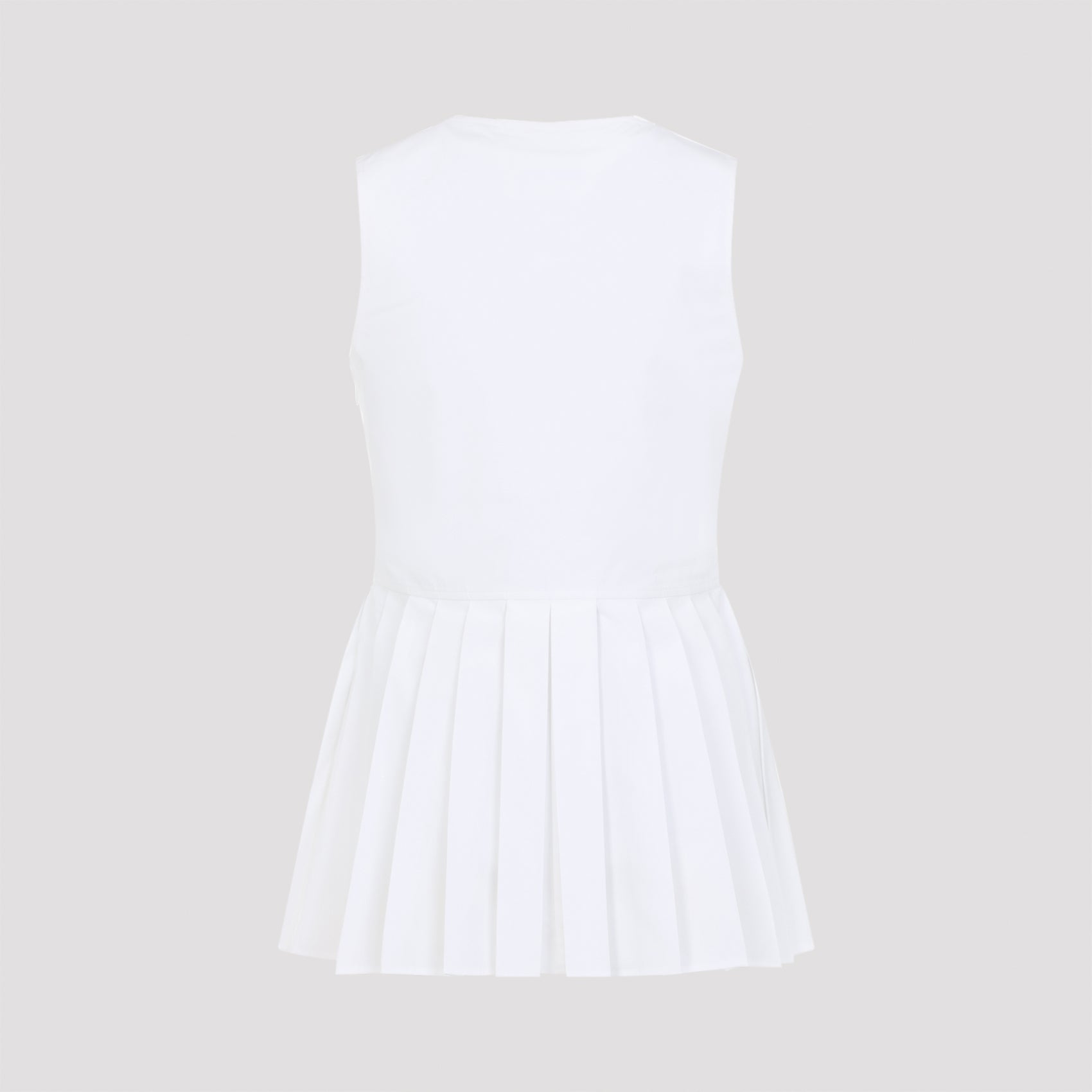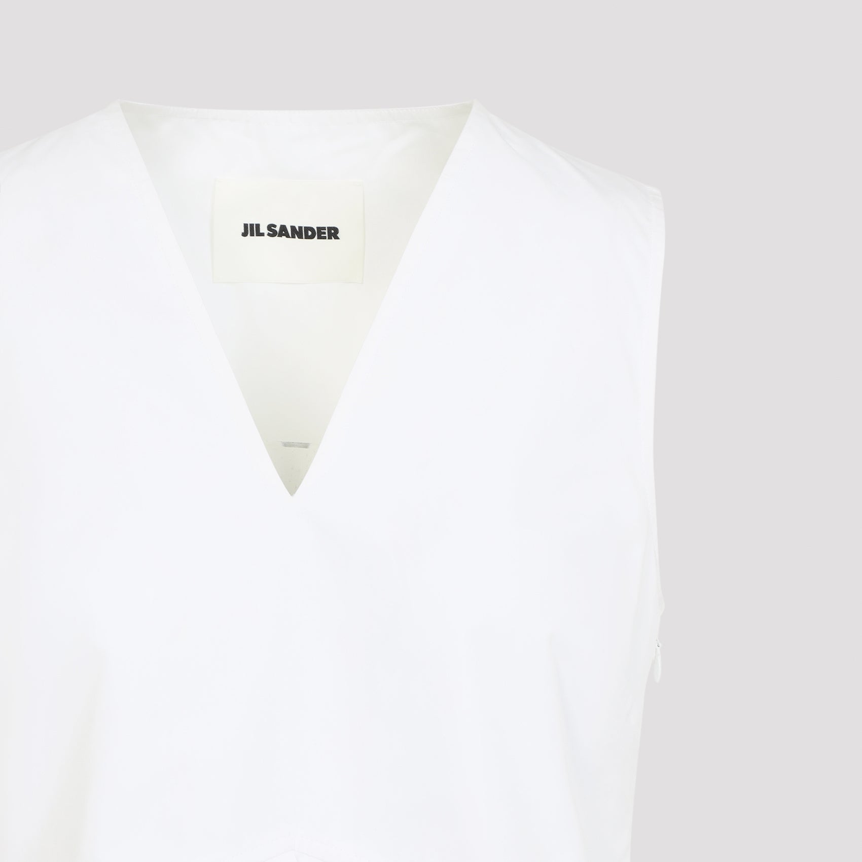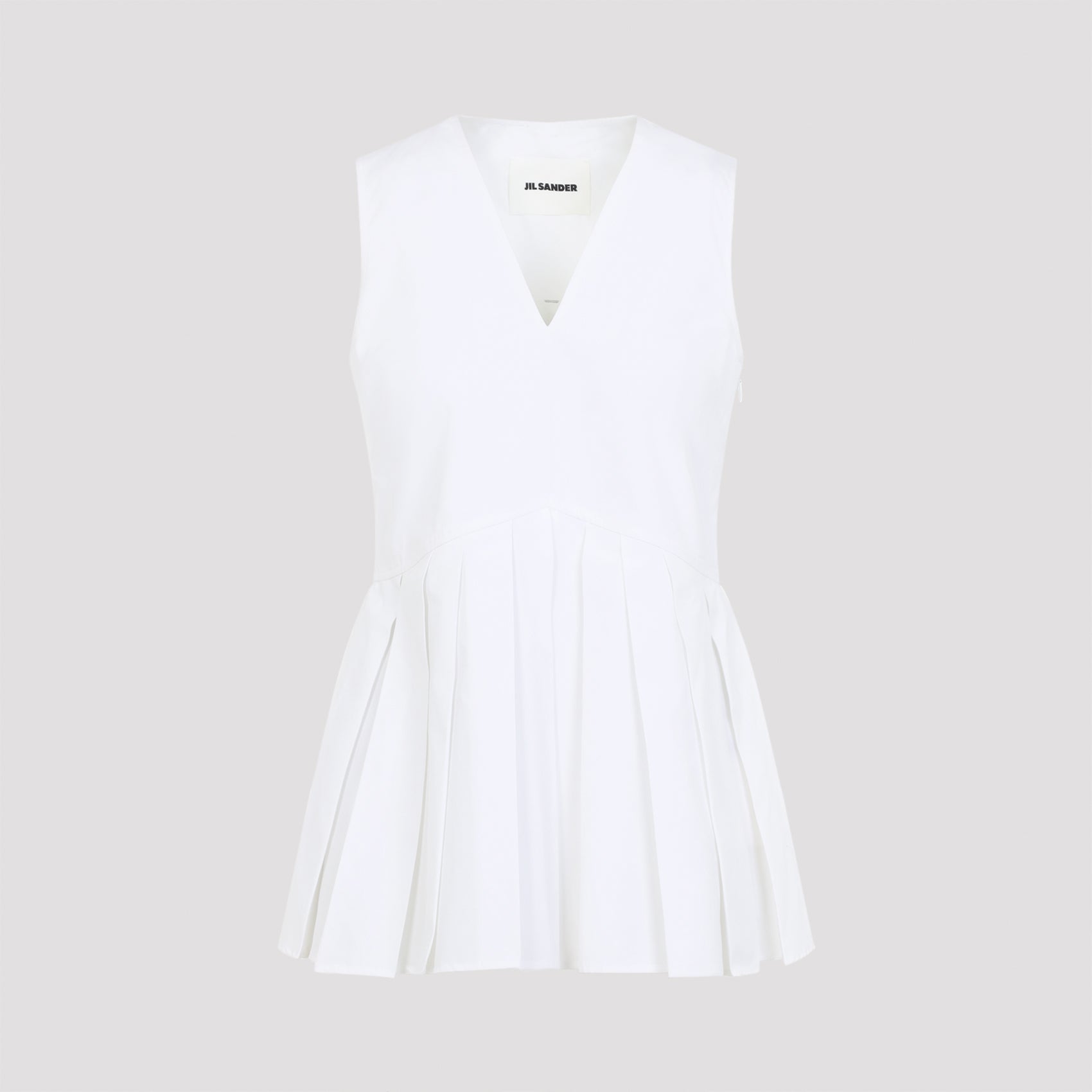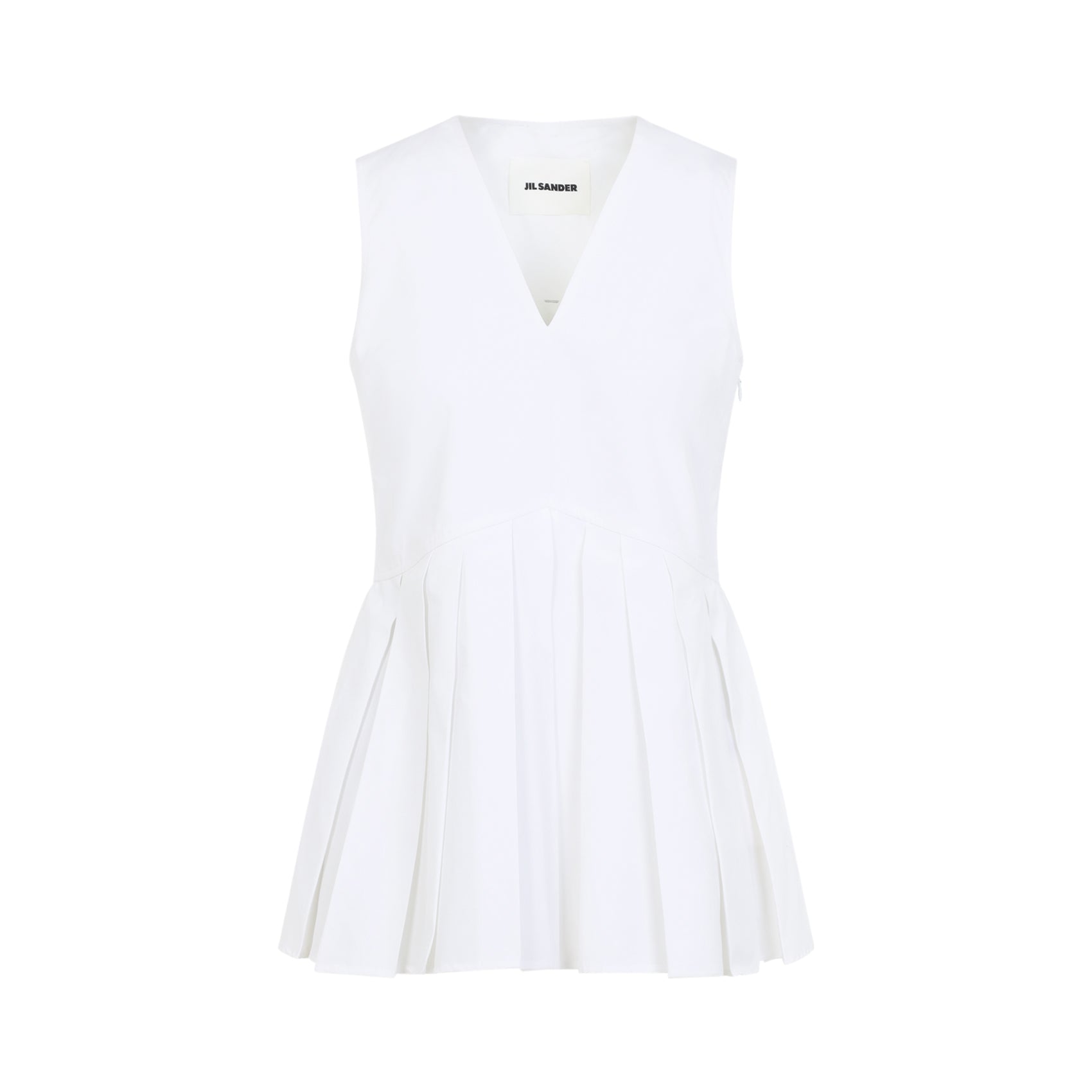Jil Sander Sleveless A-Line Pleated White Cotton Top. Sleeveless top crafted from optic white cotton, it features a V-neckline, a concealed side zip fastening, and a pleated hem that enhances the A-line silhouette.