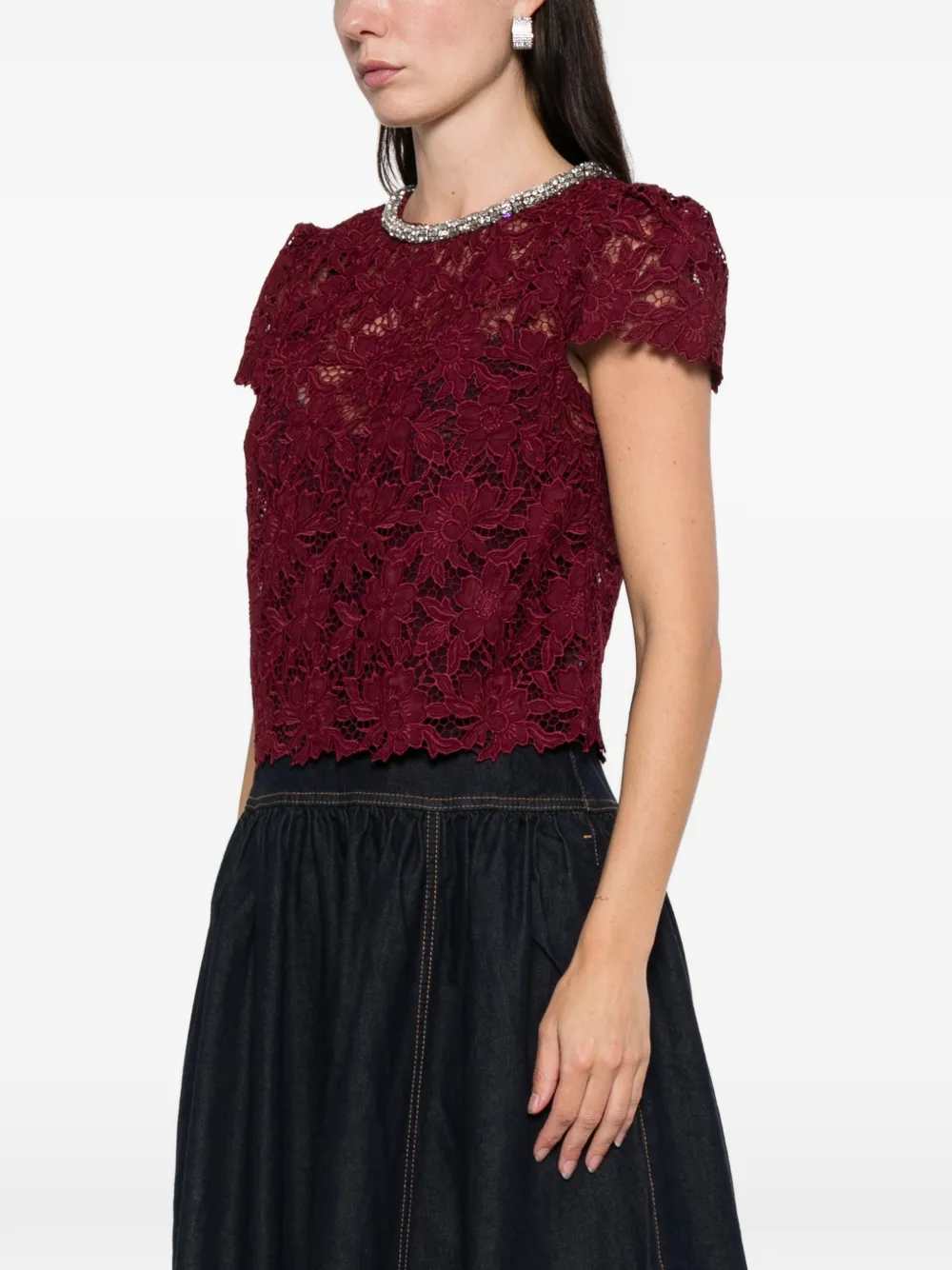 Blusa con decorazione Caratteristiche borgogna pizzo scollo con cristalli maniche corte chiusura con zip Composizione poliestere 100% Istruzioni per il lavaggio Lavare solo a secco ID RS26171TABU