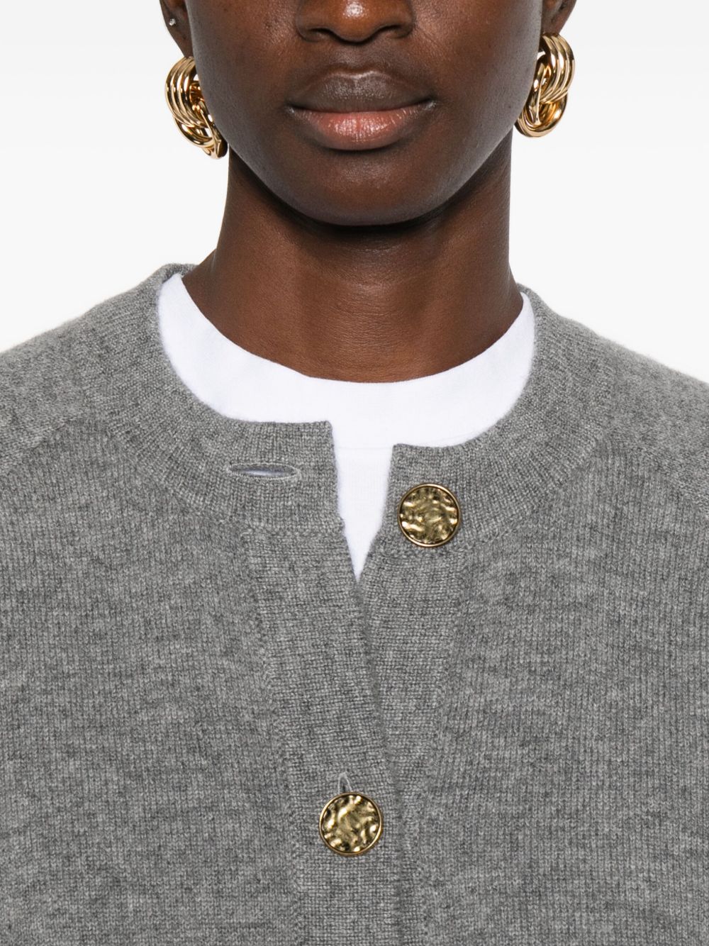 grey round neck front button fastening two front patch pockets long sleeves straight hem