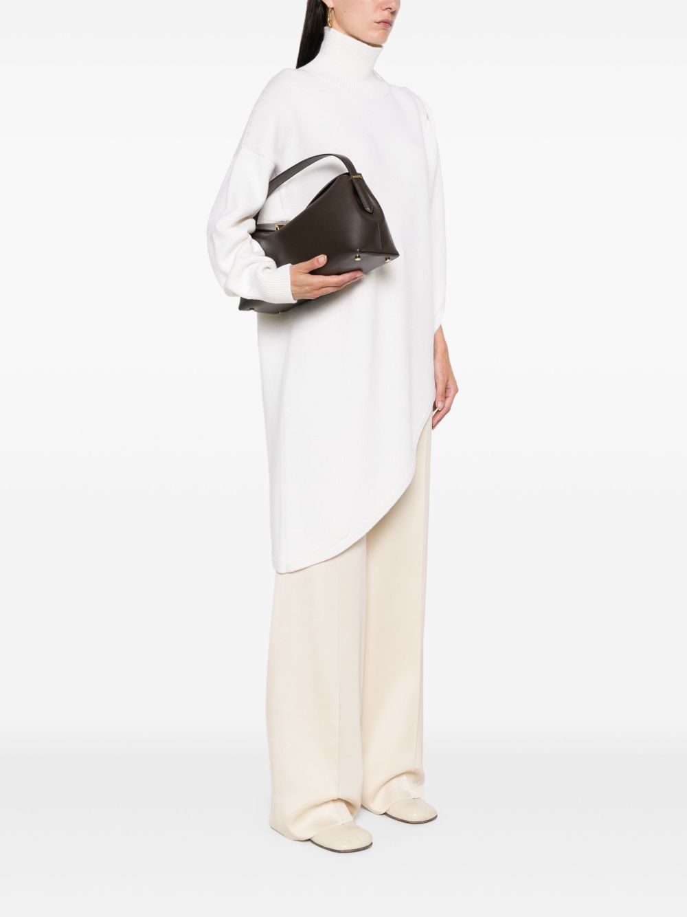 coffee brown calf leather smooth grain T-lock fastening single top handle adjustable detachable shoulder strap main compartment multiple internal slip pockets suede lining metal feet