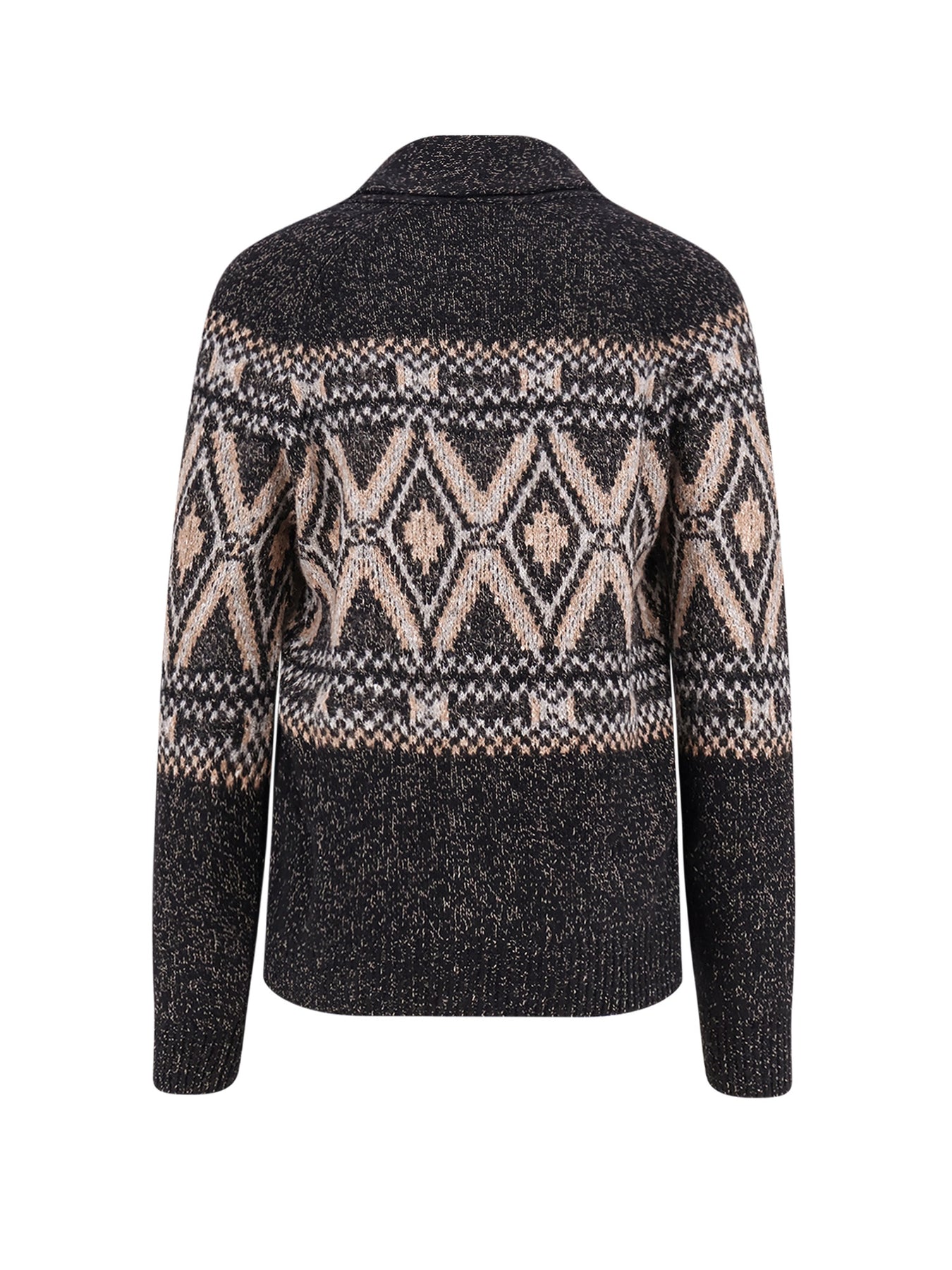 Metal button closure with logo Shawl collar Long sleeves with cuffs Made in Italy 70% virgin wool, 22% silk, 8% cashmere SKU: MRI505406CUL12