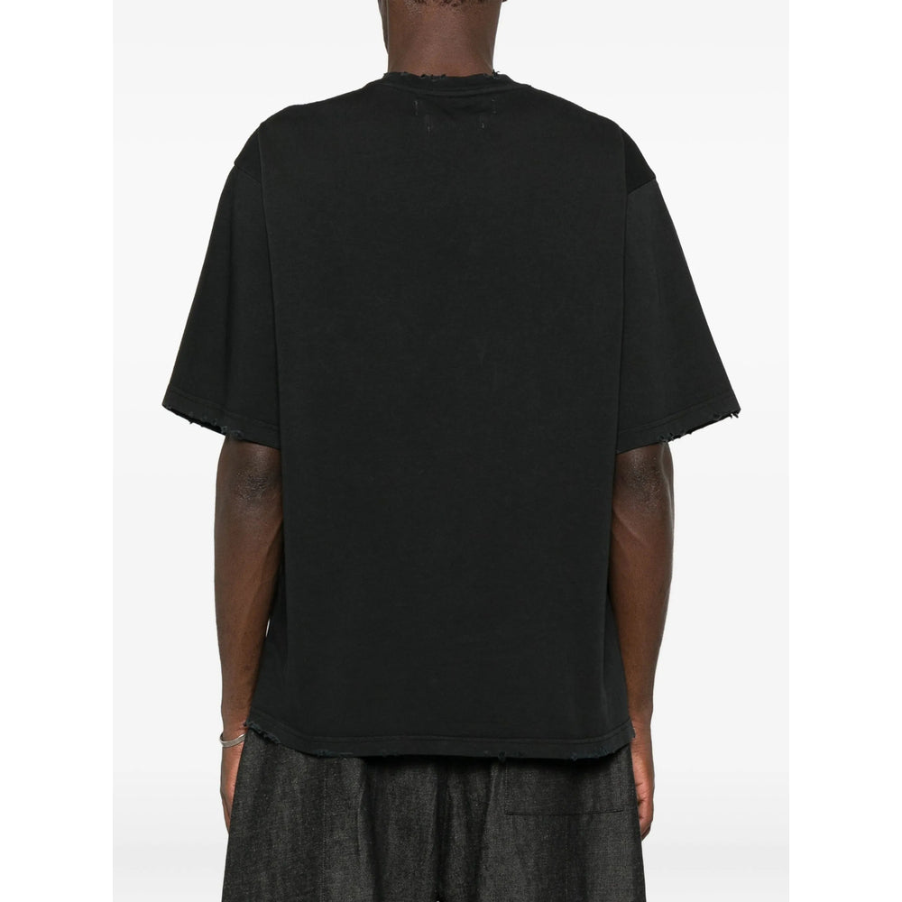 black round neck short sleeves frayed hem frayed cuffs tonal stitching