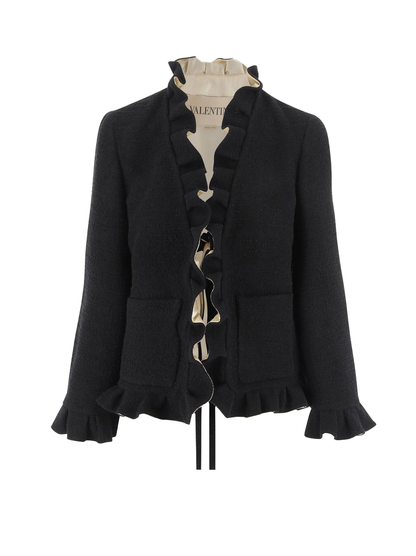 Silk band closure Ruffled profiles Double patch pocket Long sleeves with ruffles Contrasting silk lining Made in Italy 100% silk SKU: 7B3CE4M07LV0NO