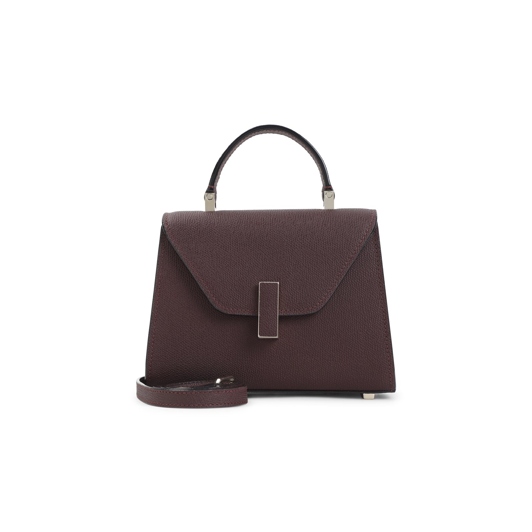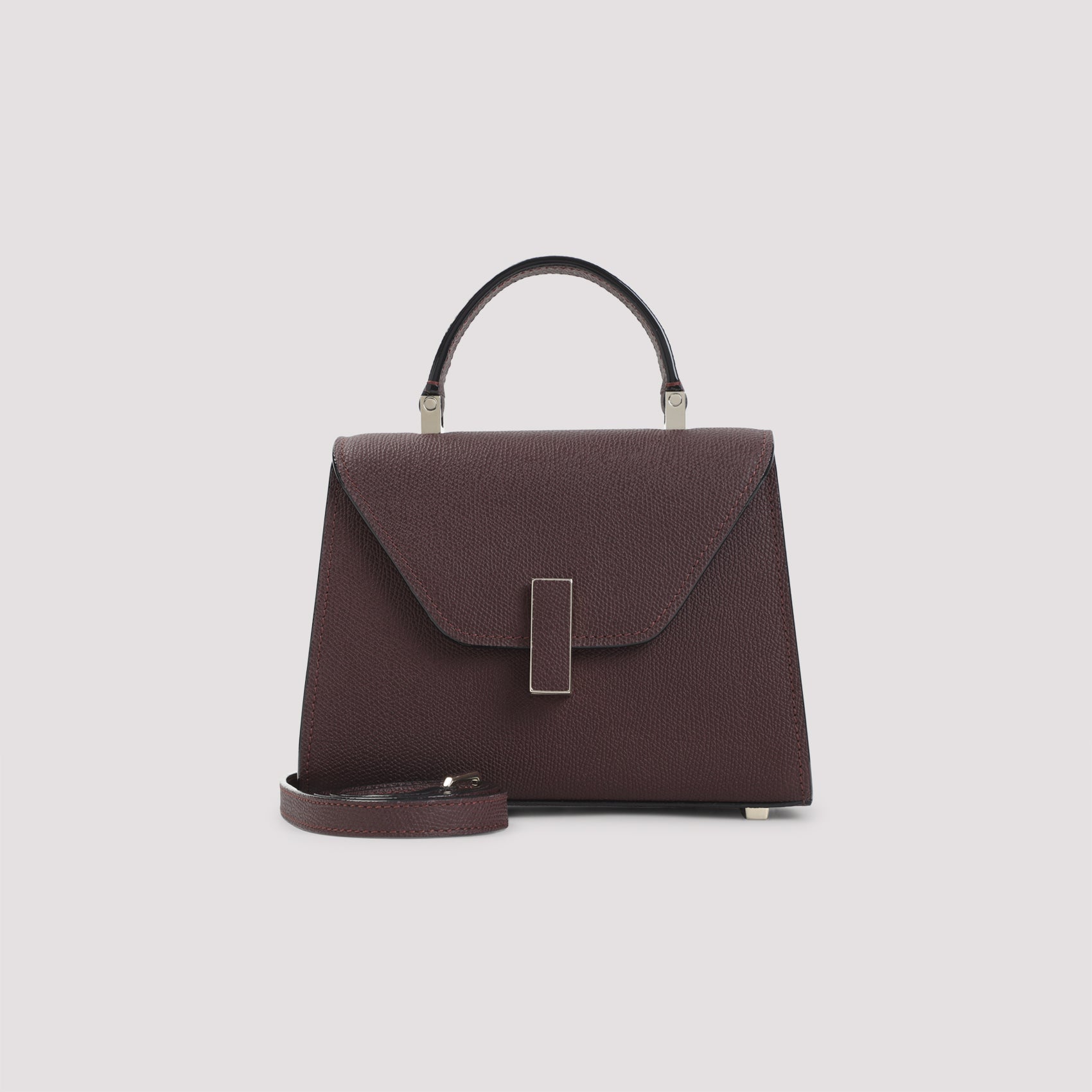 Valextra Amaranto Mine Iside Crossbody Micro Bag. Amaranto Mine leather, golden-tone clasp closure with a leather insert. Tonal detachable and adjustable strap, signature black lacquered Costa edges painted by hand. Handle on top, golden-tone hardware. Fully lined.