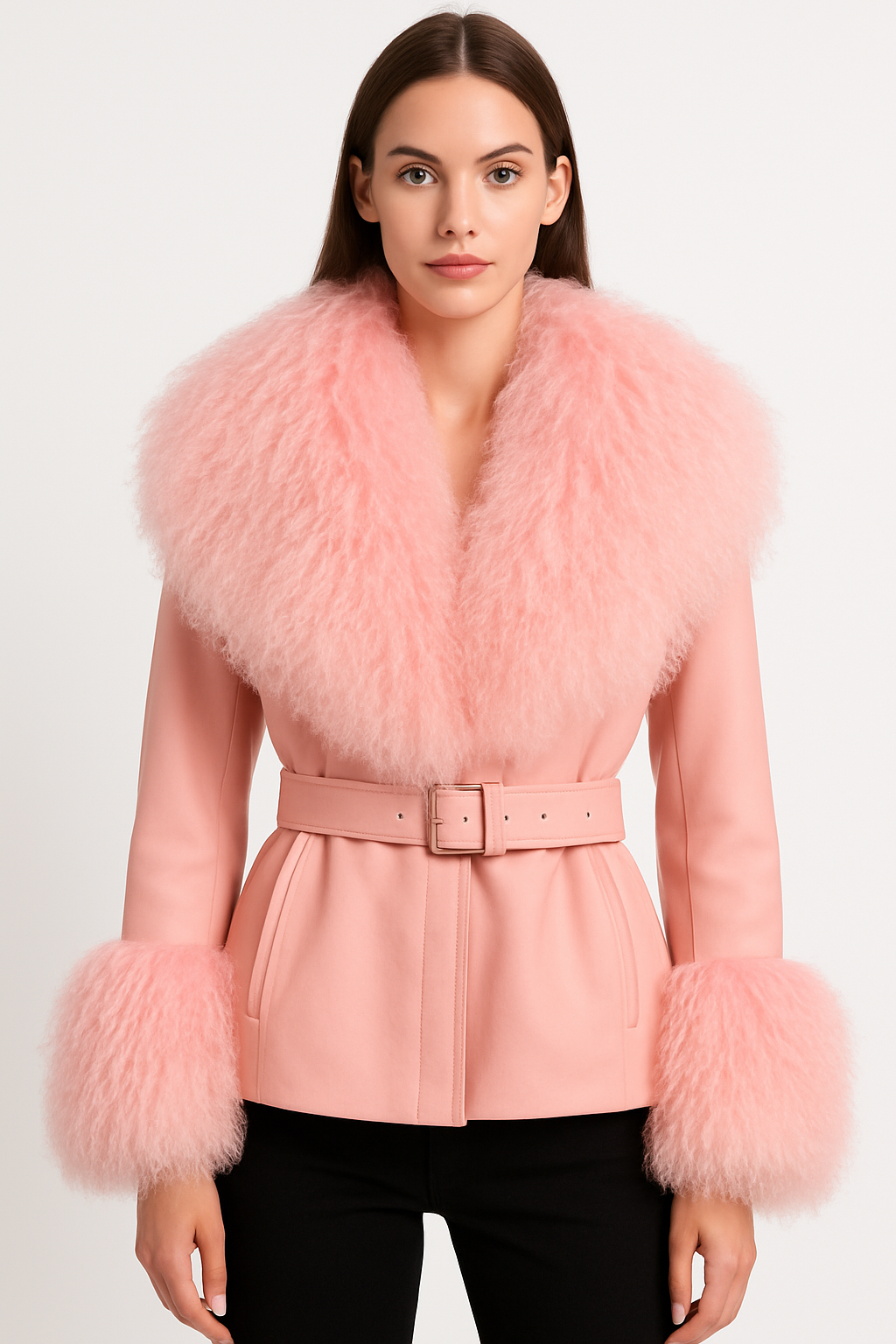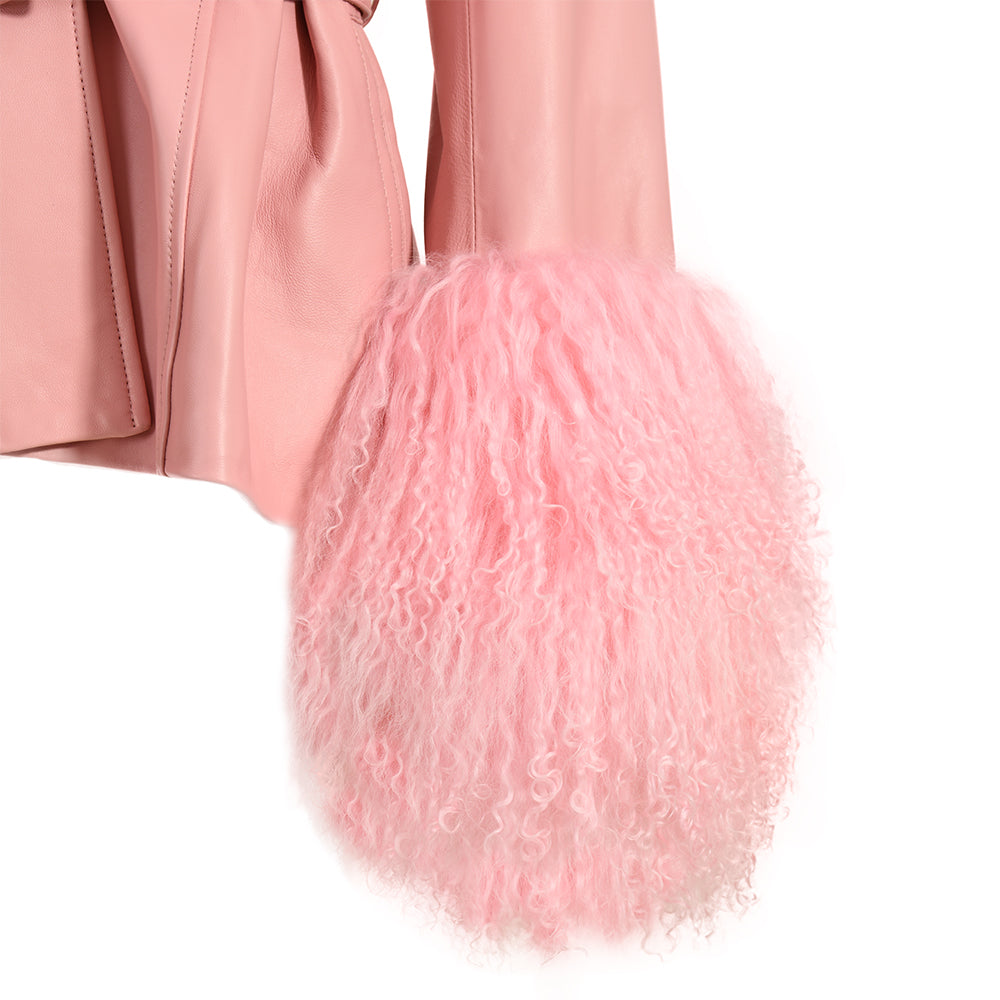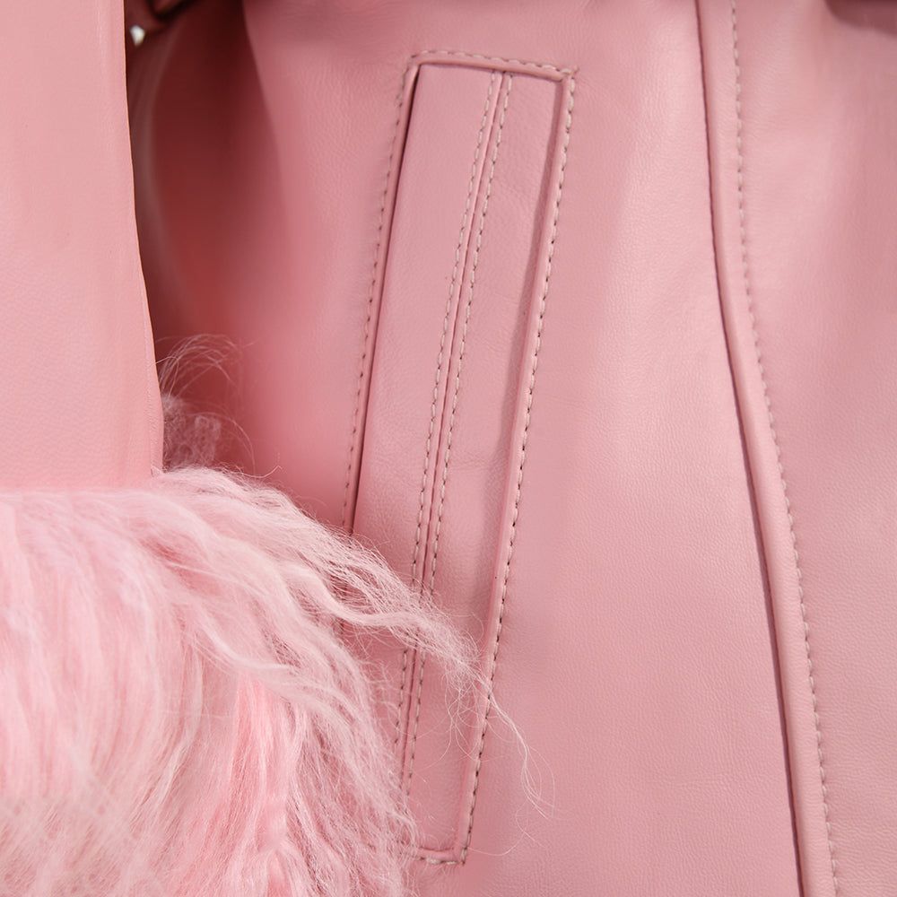 Wanan Touch Giacca Pegghy in pelle con inserti in lana di pecora con pregiata lavorazione effetto pelliccia . Chiusura con bottoni e cintura rimovibile e regolabile in vita.