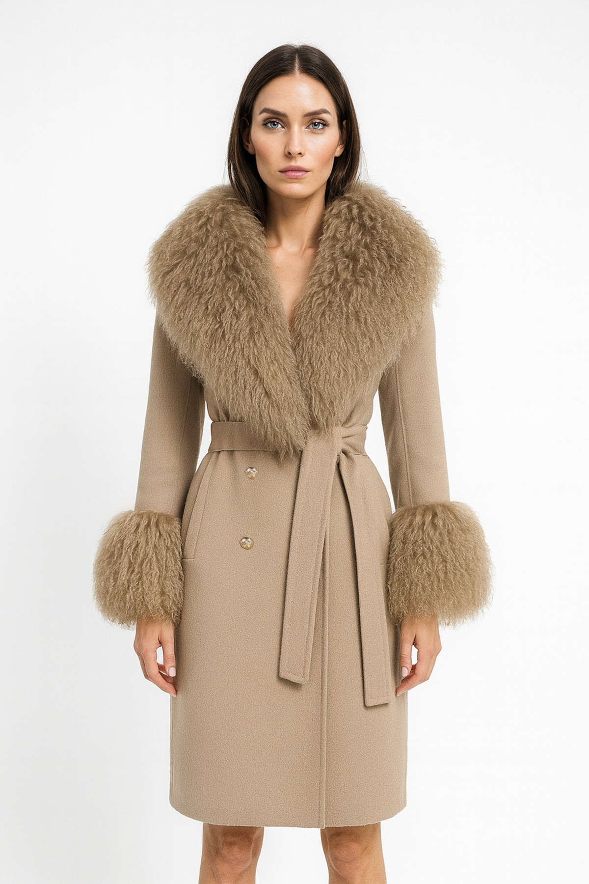 Wanan Touch cappotto in cachemire, modello con dettagli in Mongolia lavorata finemente. Chiusura con bottoni e cintura rimovibile