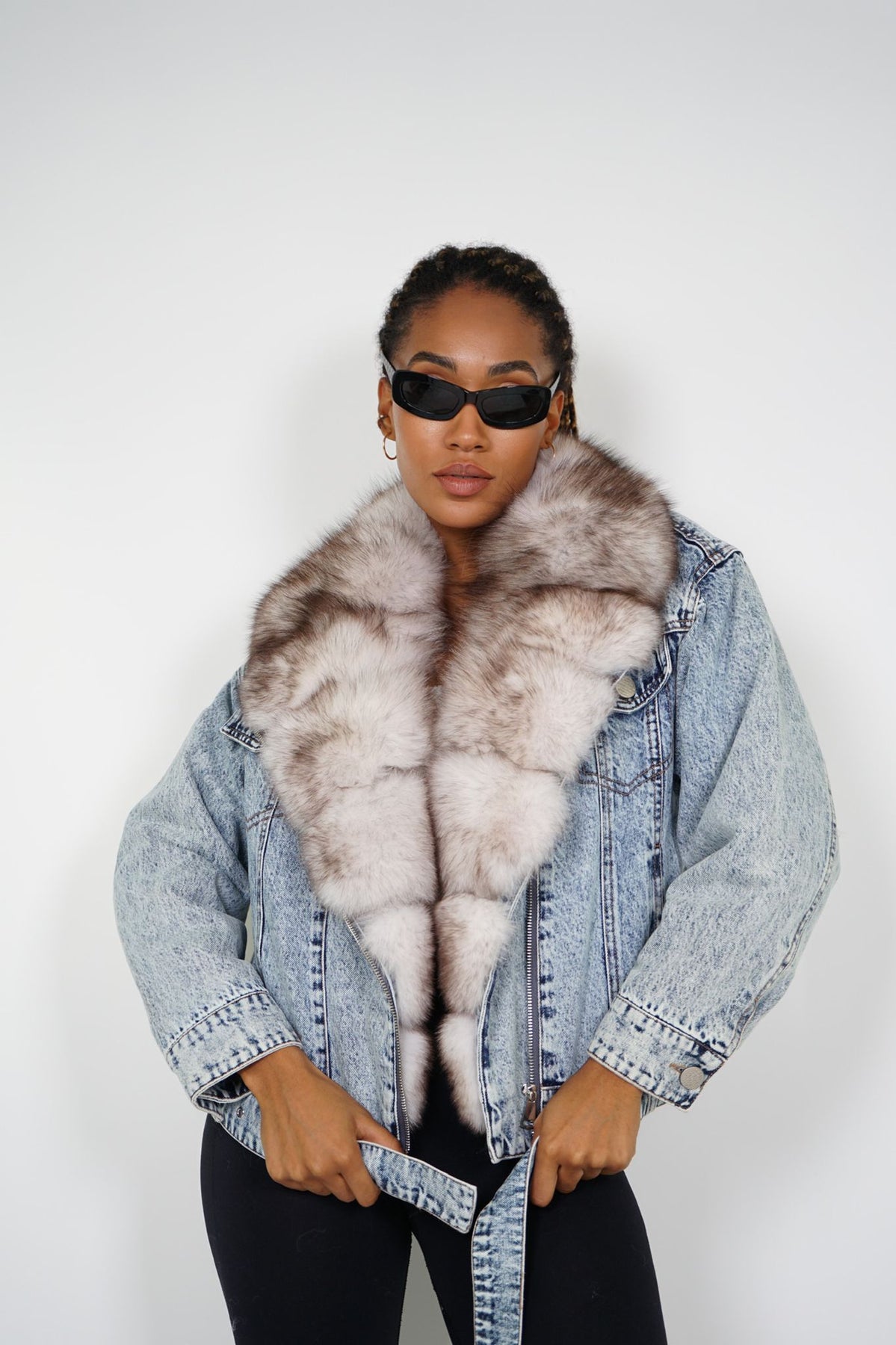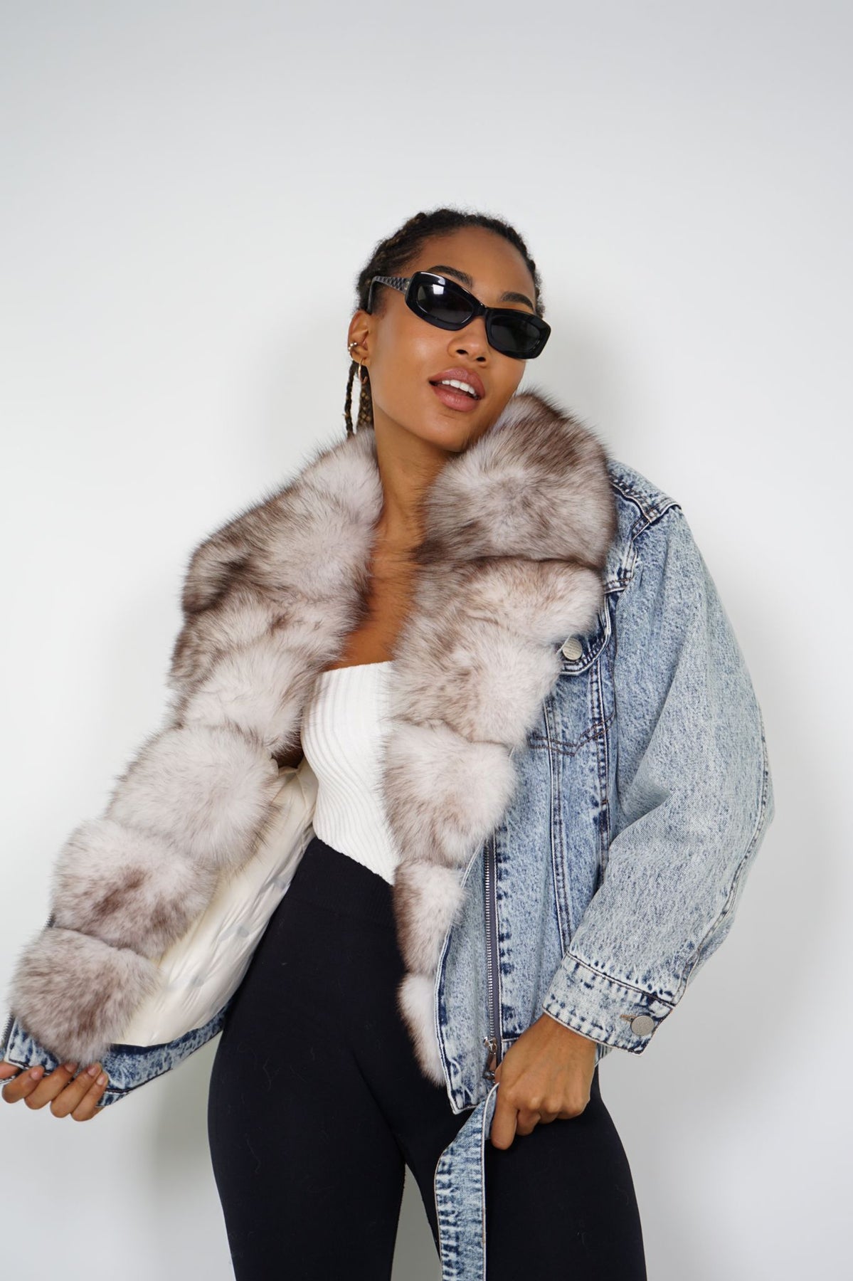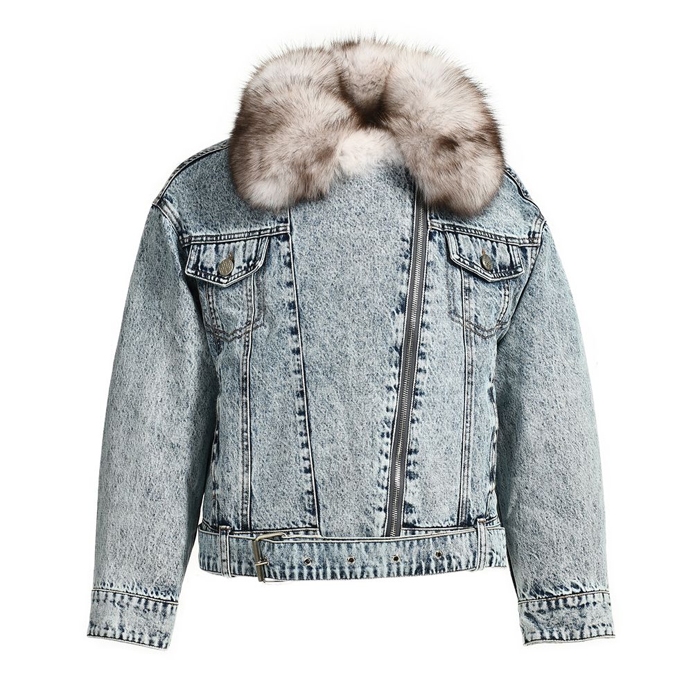 Wanan Touch Giacca in jeans chiaro con pelliccia di volpe. Chiusura con zip e cintura regolabile in vita. Disponibile anche la variante con cappuccio.