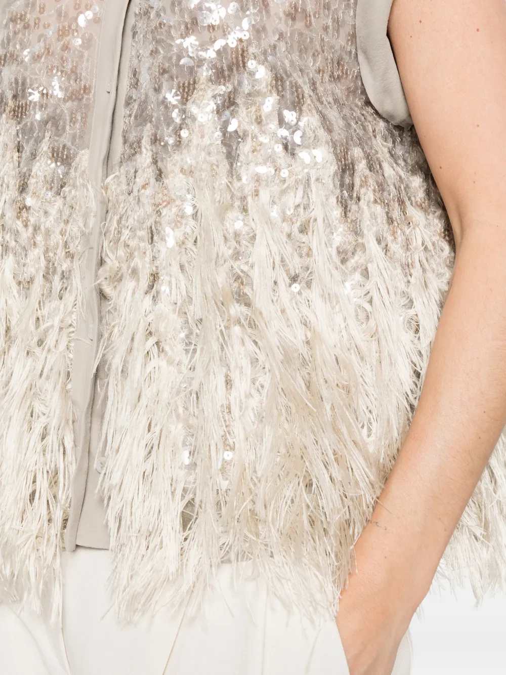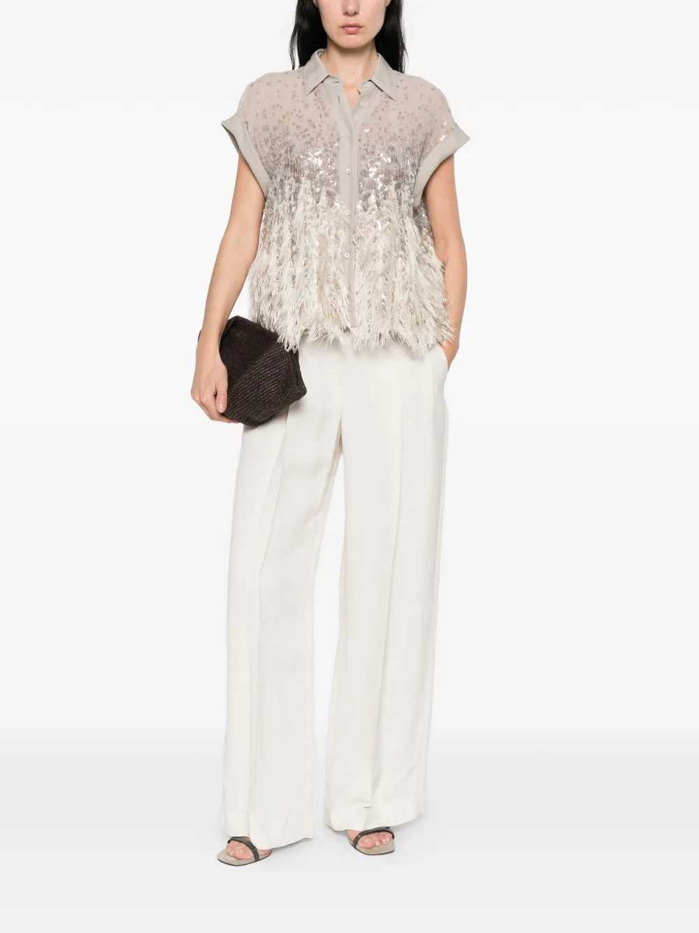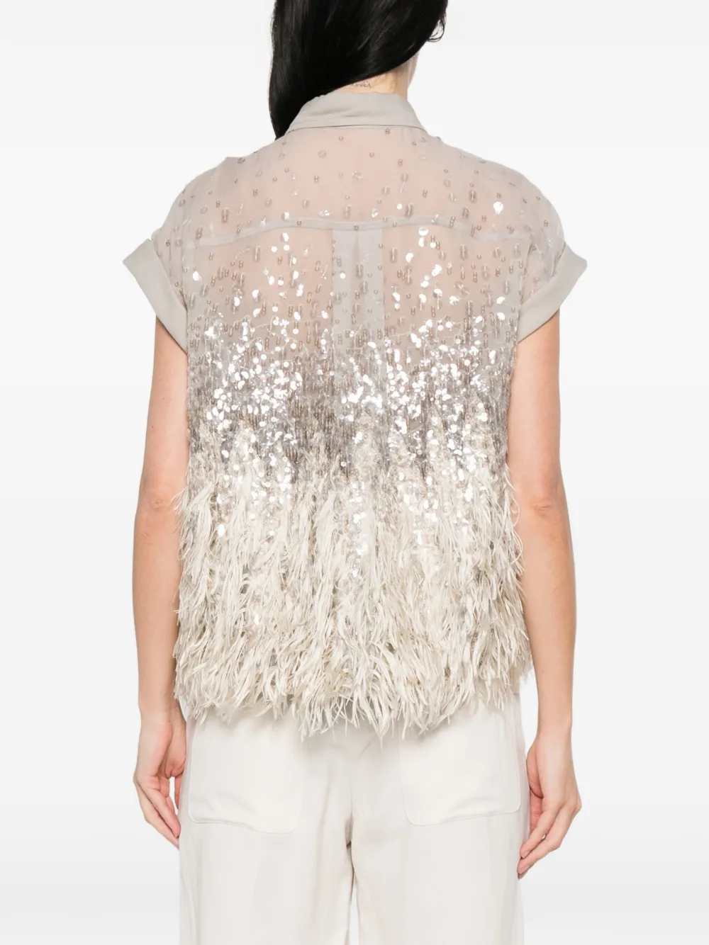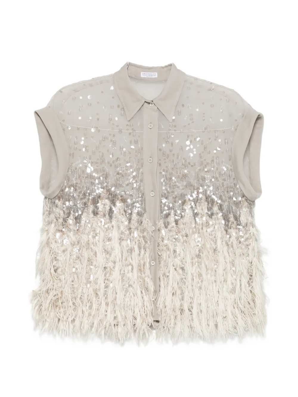 camicia con frange di paillettes abbellimento di paillettes grigie dettagli con frange chiusura con bottoni maniche con risvolto colletto classico Origine: Italia Composizione seta 100%, poliestere 100% Istruzioni per il lavaggio Lavare solo a secco ID MF940RK106