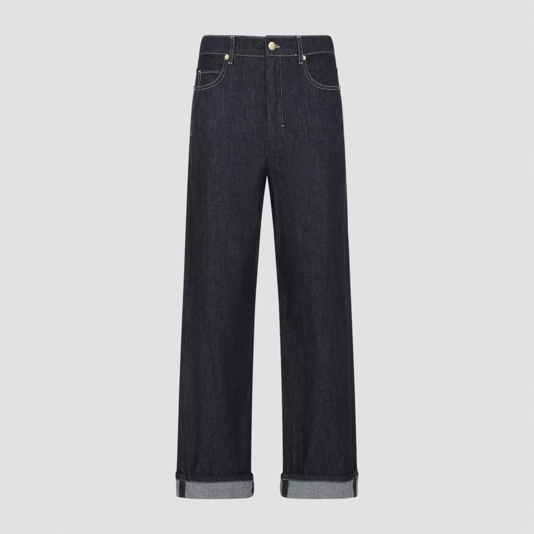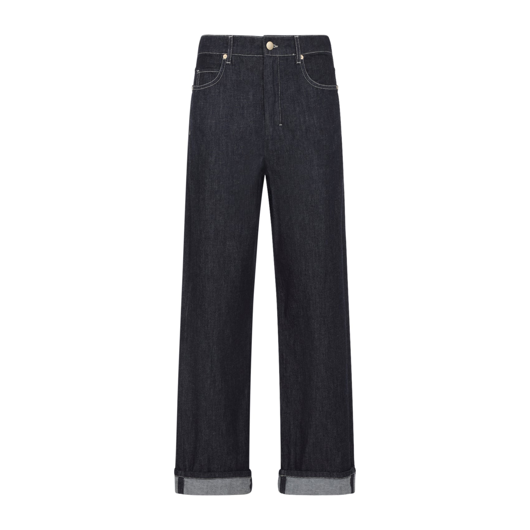 Max Mara`s Chiara Blue Cotton Jeans. 5-pocket jeans crafted from garment-dyed blue cotton denim, featuring a mid-waist, belt loops, front button and zip-fly fastening, a branded label at the back of the waist, a wide leg, and turn-up hems.