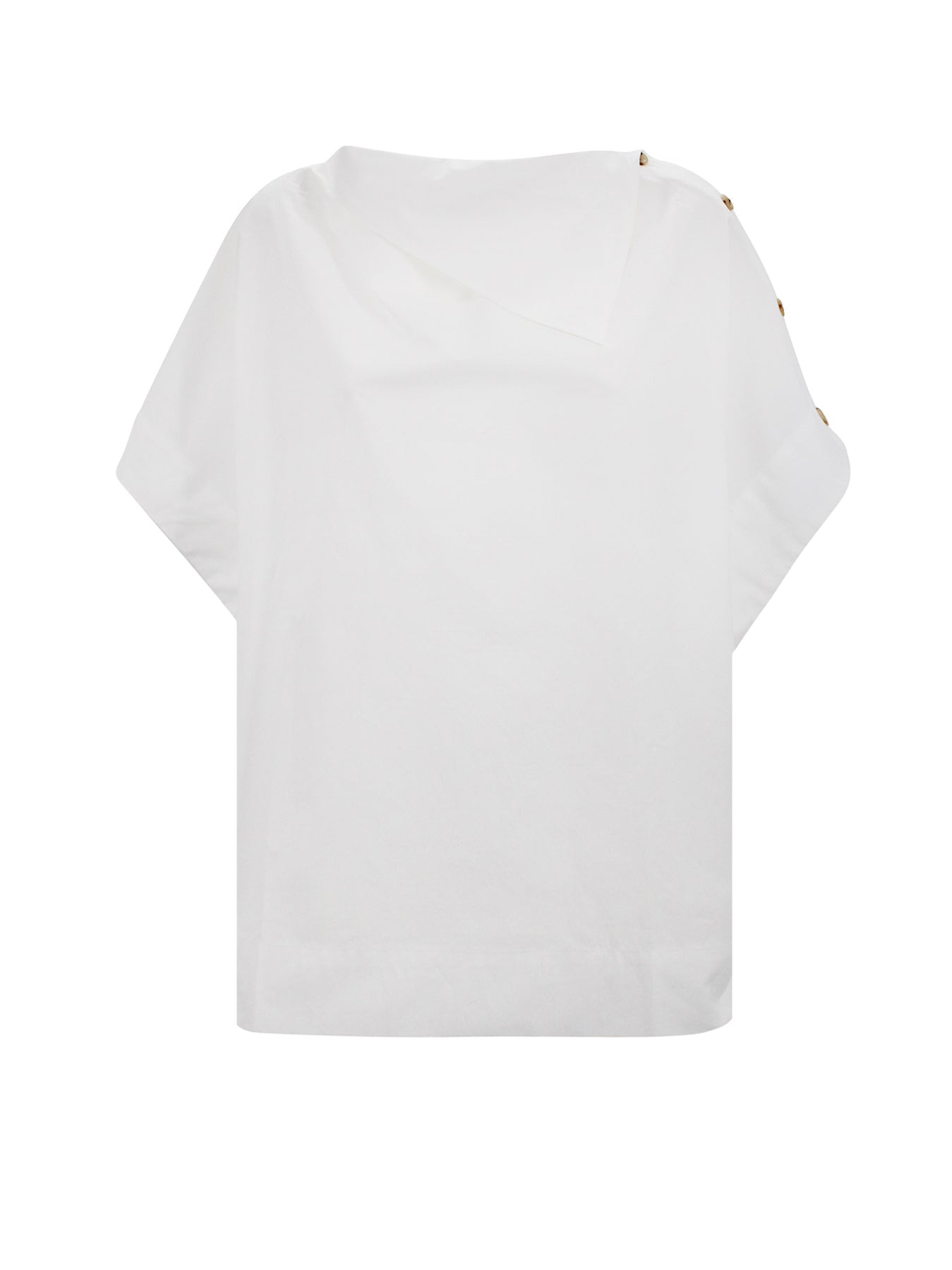 Boat neckline with asymmetrical detail Short sleeve Button detail on one sleeve Boxy fit 100% organic cotton SKU: CHE0678ISSABLA1226S