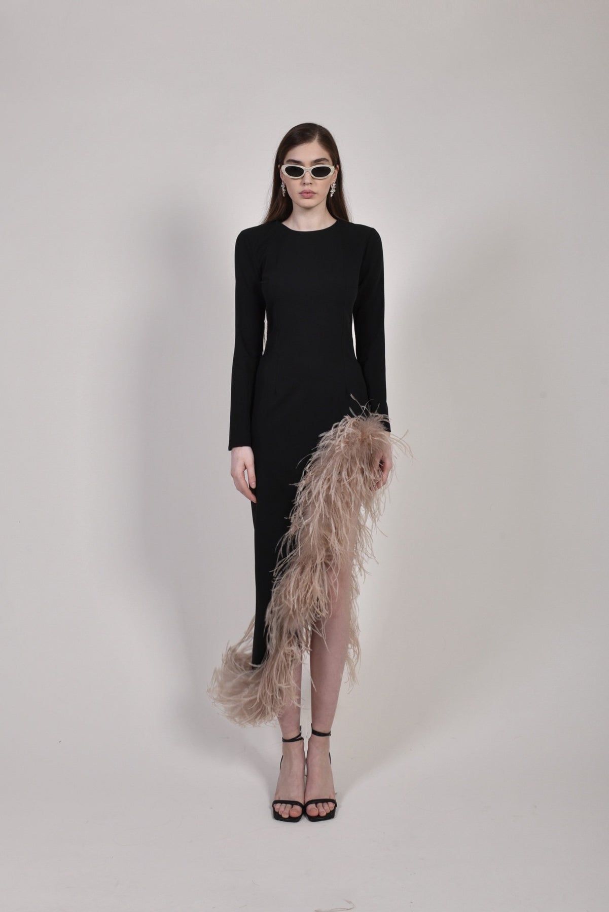 The Archivia abito nero, modello con spacco laterale e dettaglio piume beige.