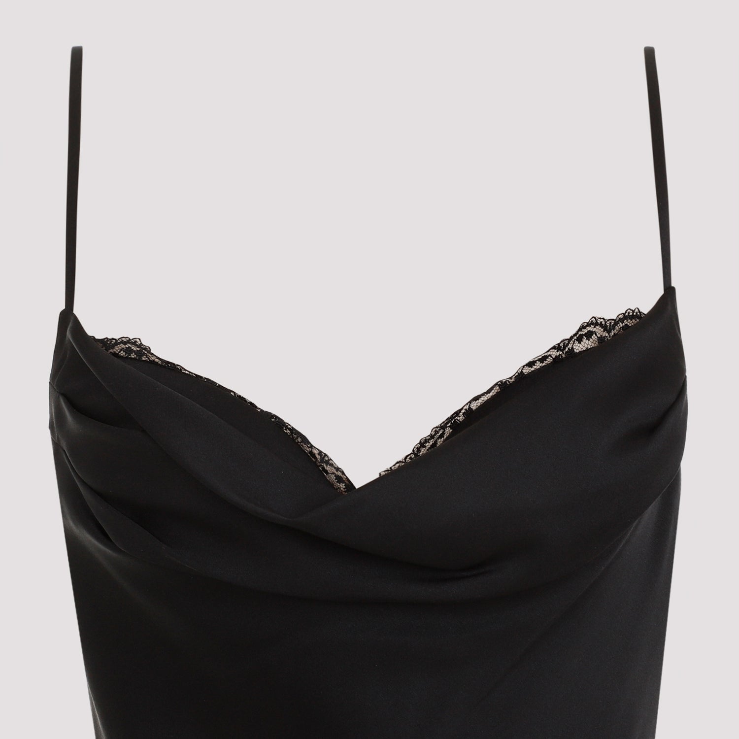 Alexander McQueen Black Silk Evening Dress. Black satin silk, slightly draped neckline with lace trim, hidden pre-formed bra cup, fine straps, back concealed closure, full length.