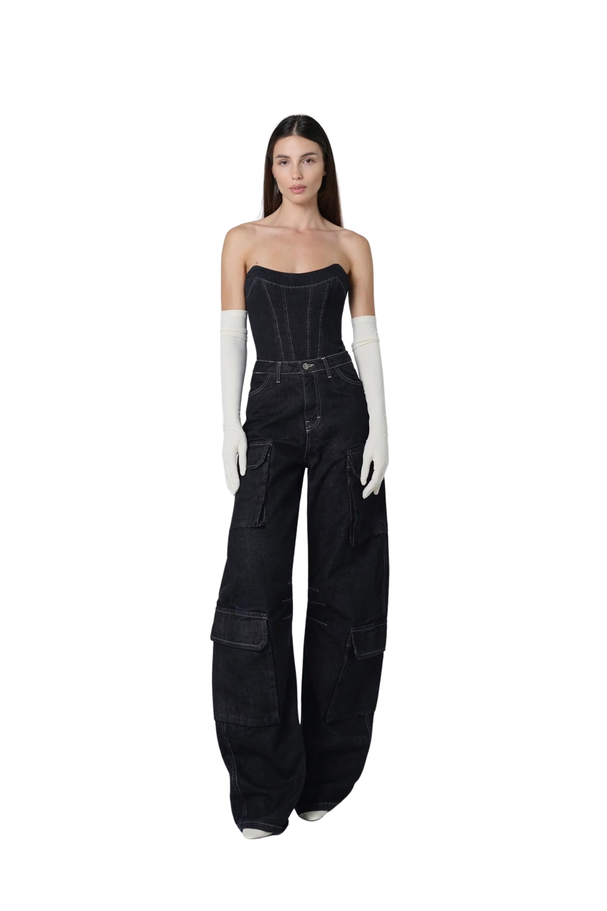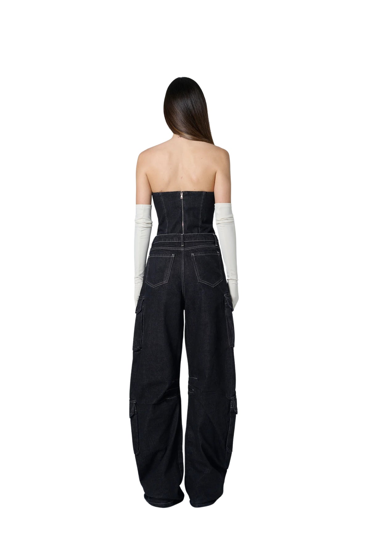 The Archivia Cargo Set Anema in denim. Modello composto da corpetto con chiusura con sul retro e pantaloni cargo.