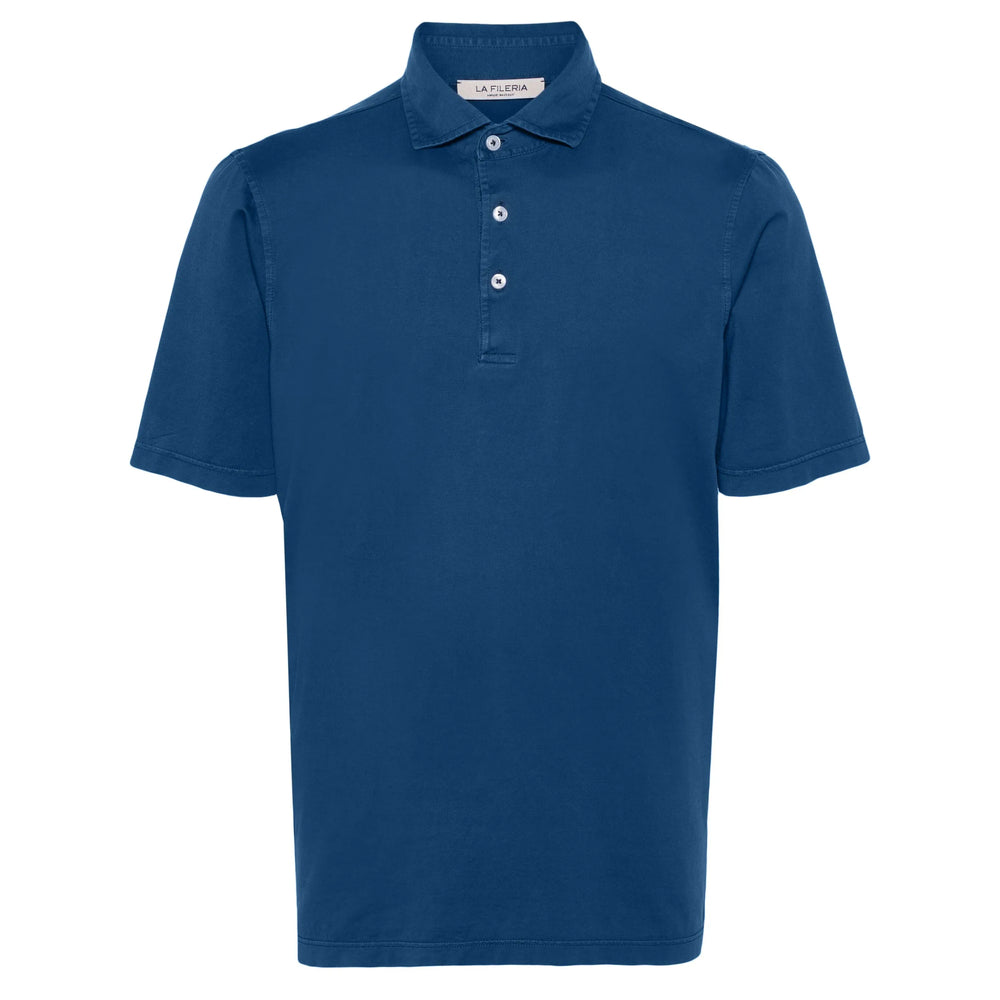 blue cotton jersey texture polo collar short sleeves short side slits straight hem front button placket