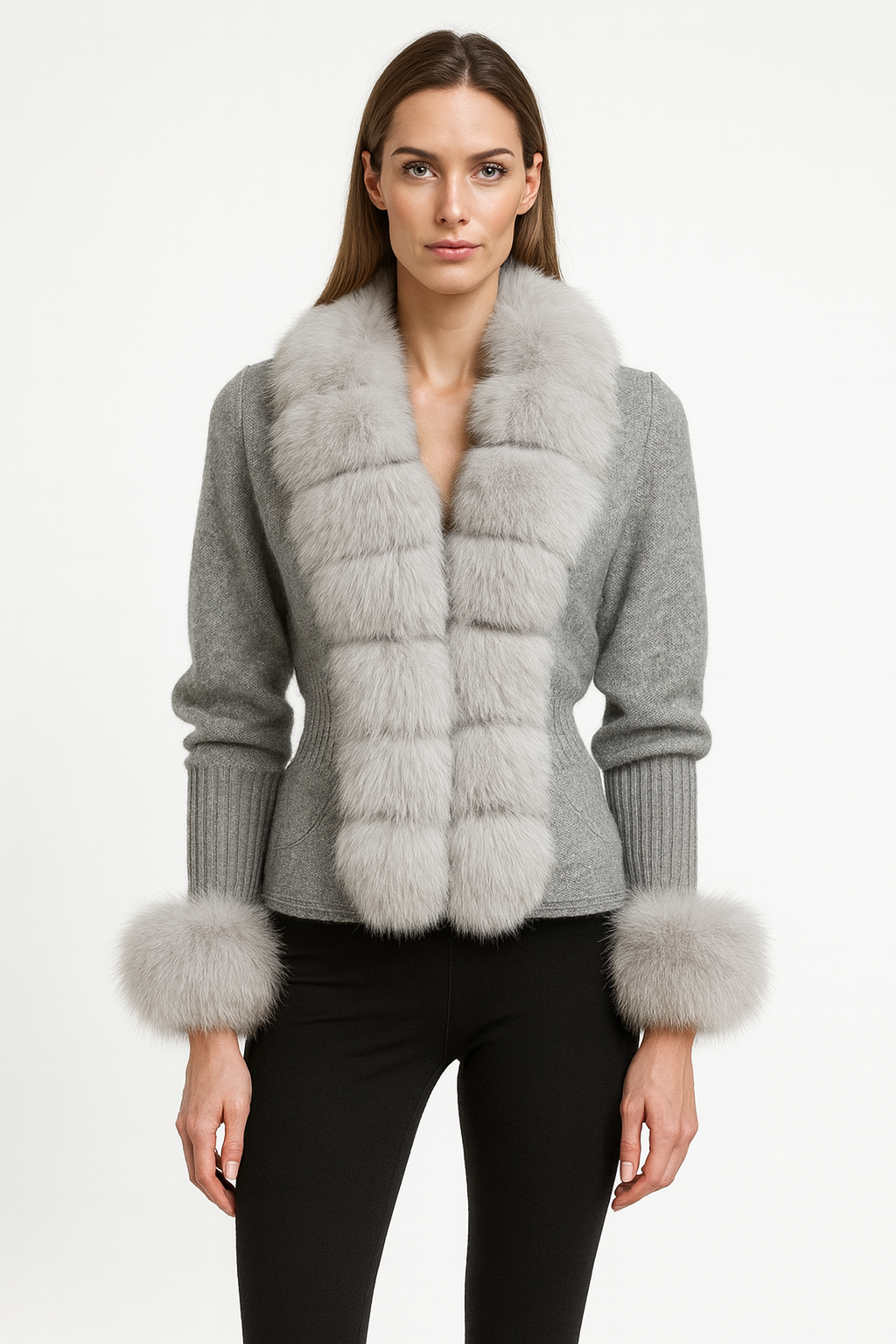 Giacca Andò Grigia by Wanan Touch. I colori sono tenui, adatti alla stagione invernale, ma soprattutto versatili. Tessuto elasticizzato e adattabile comodamente al corpo. Dettagli maniche e chiusura giacca in morbida pelliccia pregiata color Grigio.