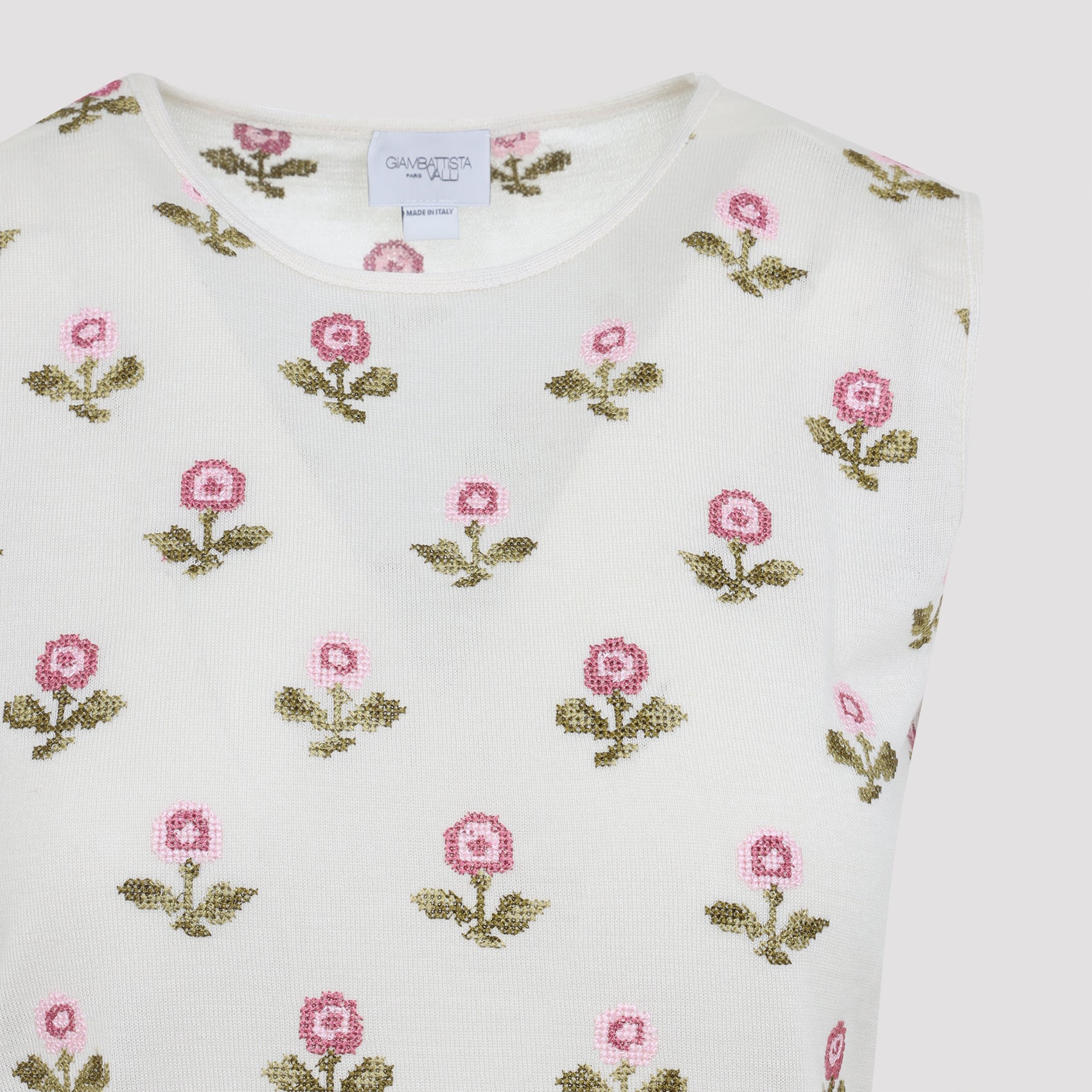 Giambattista Valli Ivory White Cashmere Knit Top. Crafted in cashmere and silk. Round neck, sleeveless, straight hem, knitted design, embroidered roses pattern all-over.