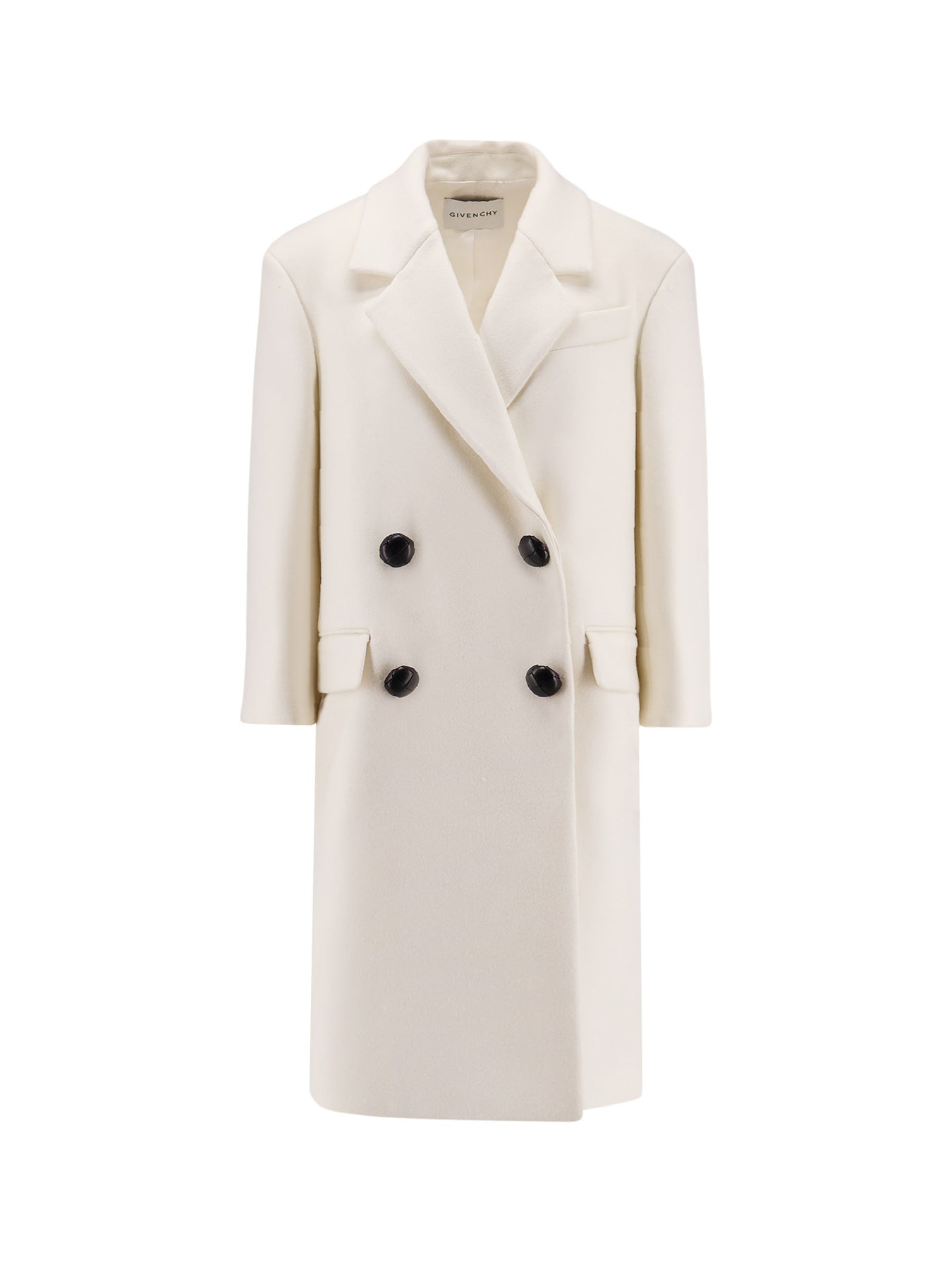 Double-breasted with buttons Maxi leather-covered buttons Front flap pockets Wide lapel Made in Italy 100% wool Lining: 100% viscose SKU: BWC0E015X2105