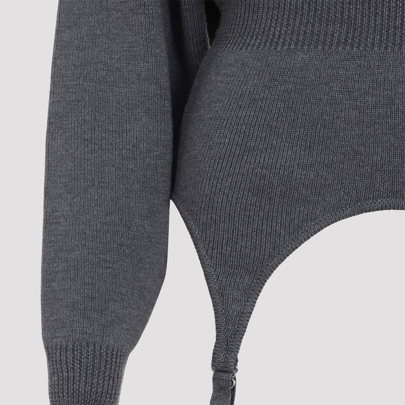 Jean Paul Gaultier Lingerie Garter Grey Merino Wool Pullover. Crafted from grey merino wool, standing collar, dropped shoulders, long wide sleeves, ribbed fitted waist, lingerie garters at the hem, horizontal belt loop at the back of the collar.