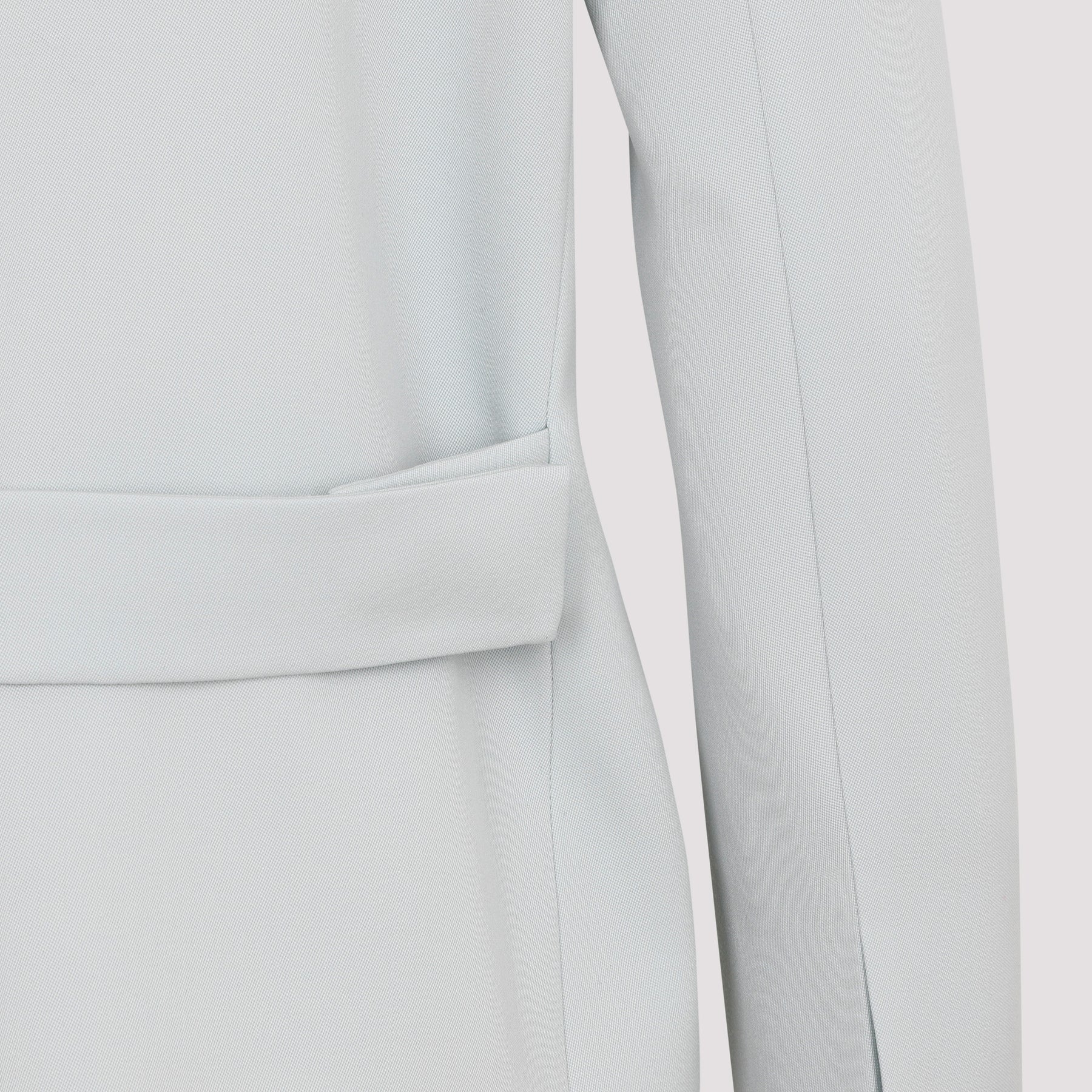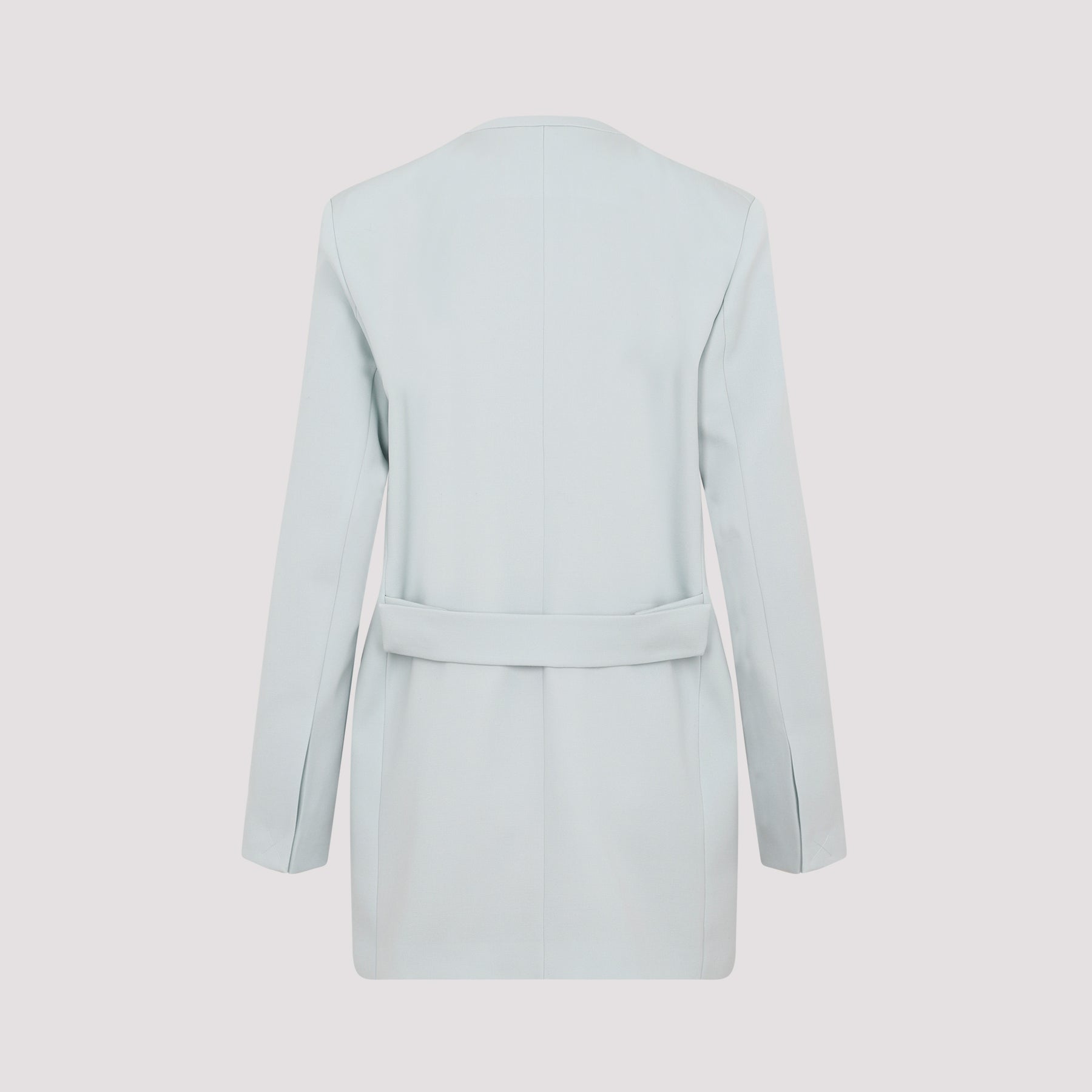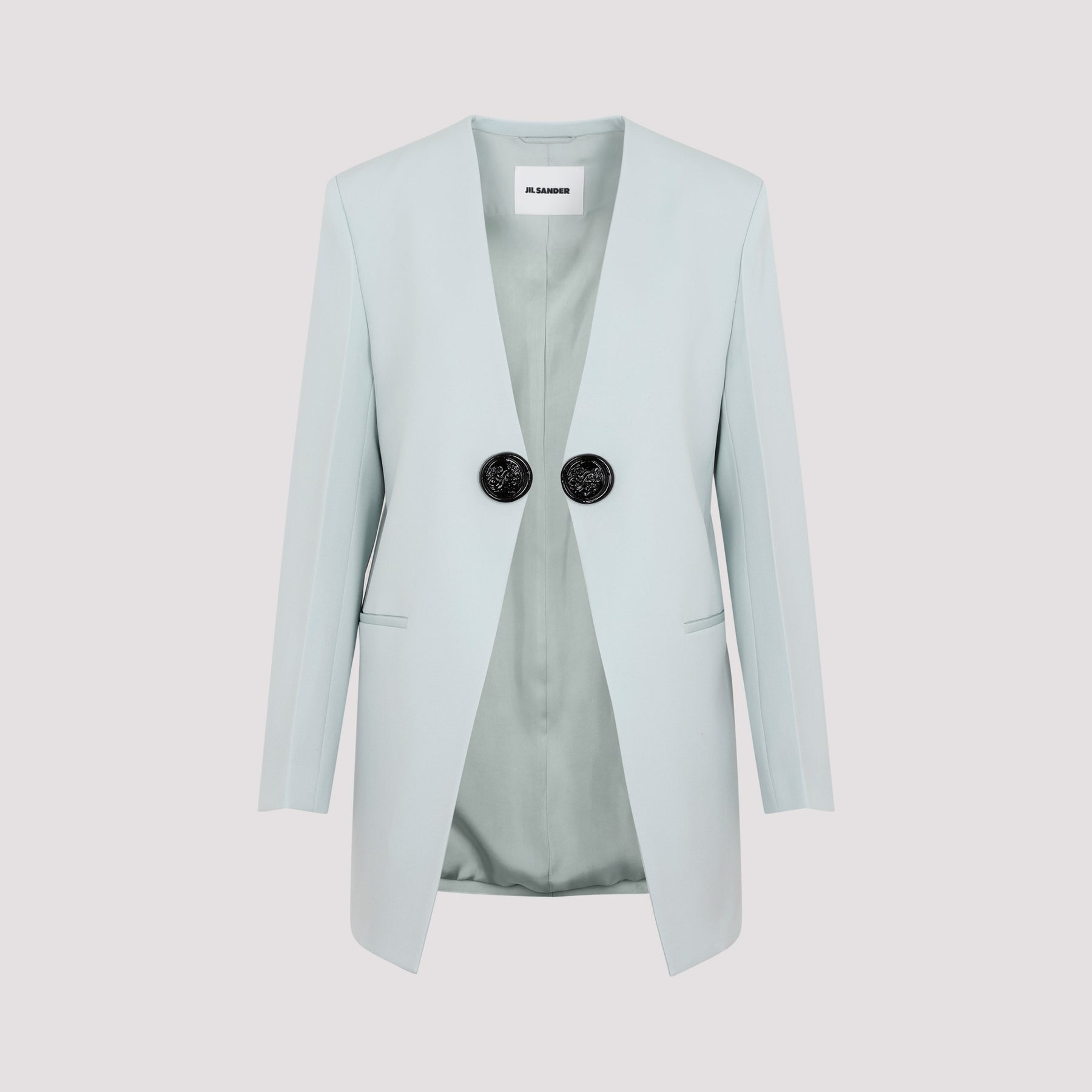 Jil Sander Chinablue Wool Jacket. Chinablue Wool, long sleeves, side pockets, fully lined, black button embossed embellishment on front, fully lined, collarless style.
