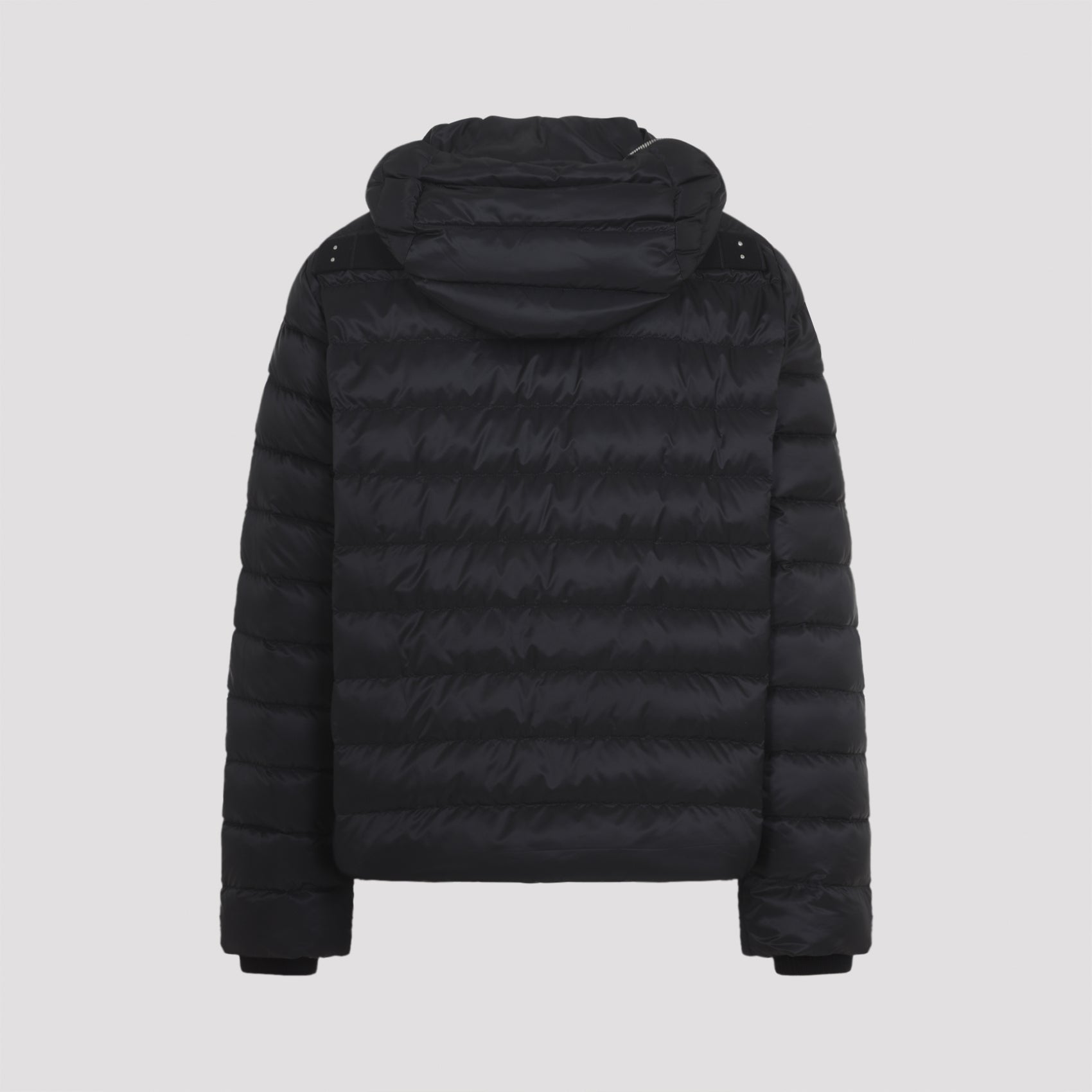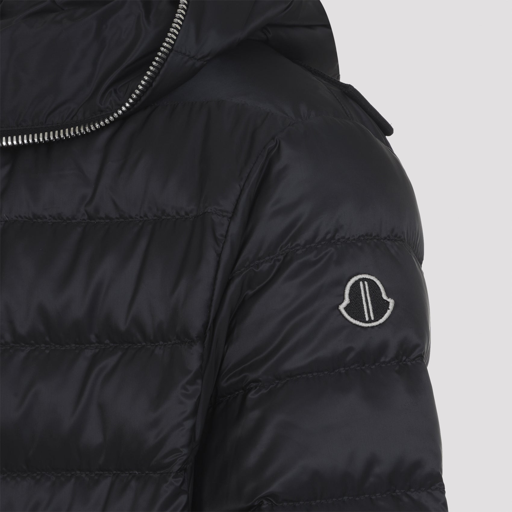 Moncler X Rick Owens Black Ziplock Jacket. Black Recycled ultra-lightweight polyester, hip length with long sleeves and has a loose fit. Centre front metal zipper that runs up and around the fixed hood, so that it can close completely over the face. Rib knit wool blend inner cuffs and side snap-welt pockets. Cotton webbing strap with rivet detail on the back yoke and has a Moncler + Rick Owens embroidered logo patch on left arm. Lined with recycled ultra-lightweight polyester and has interior pockets with snap closures. Lightweight down-filled.