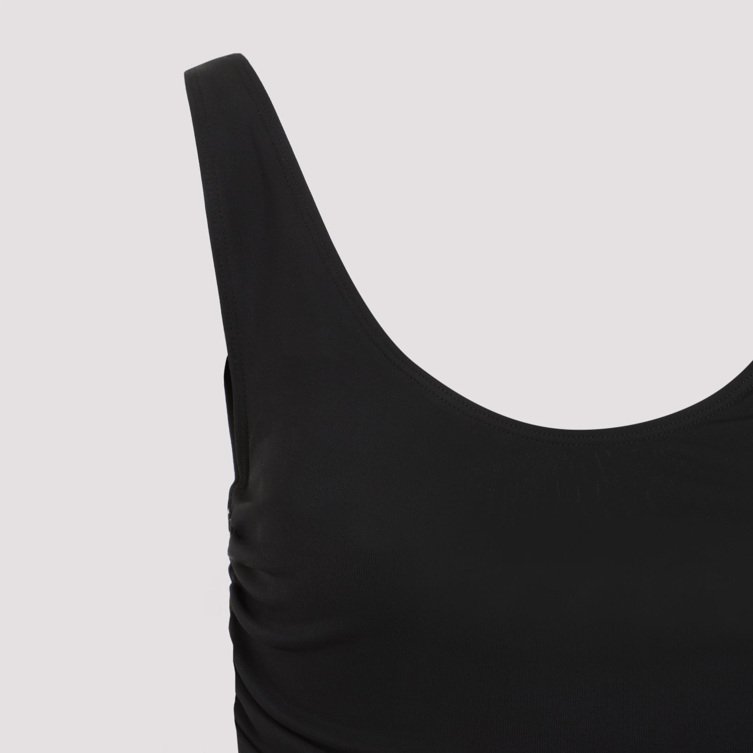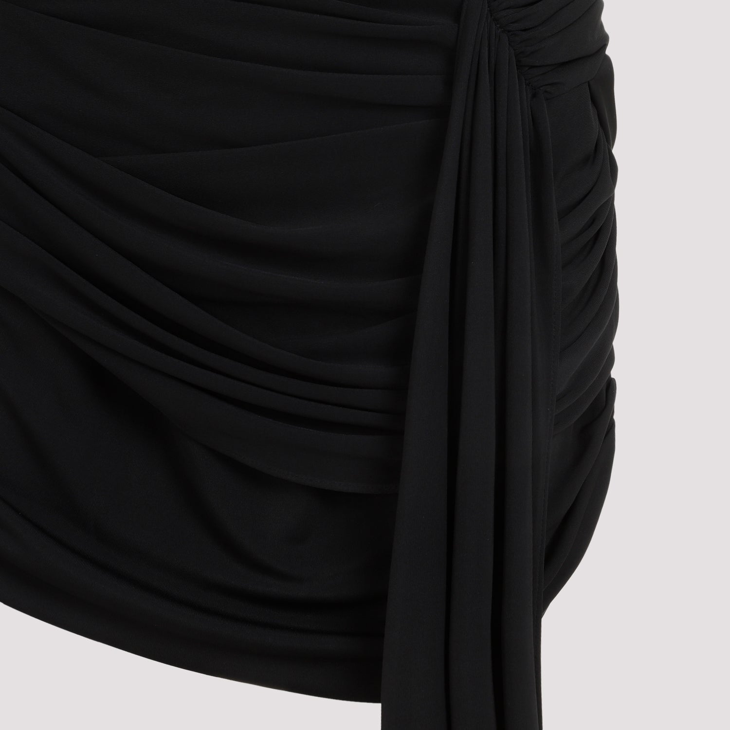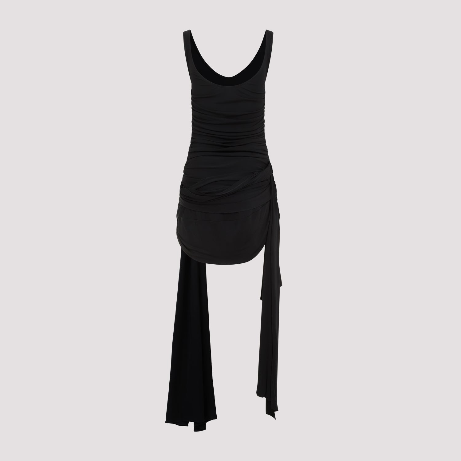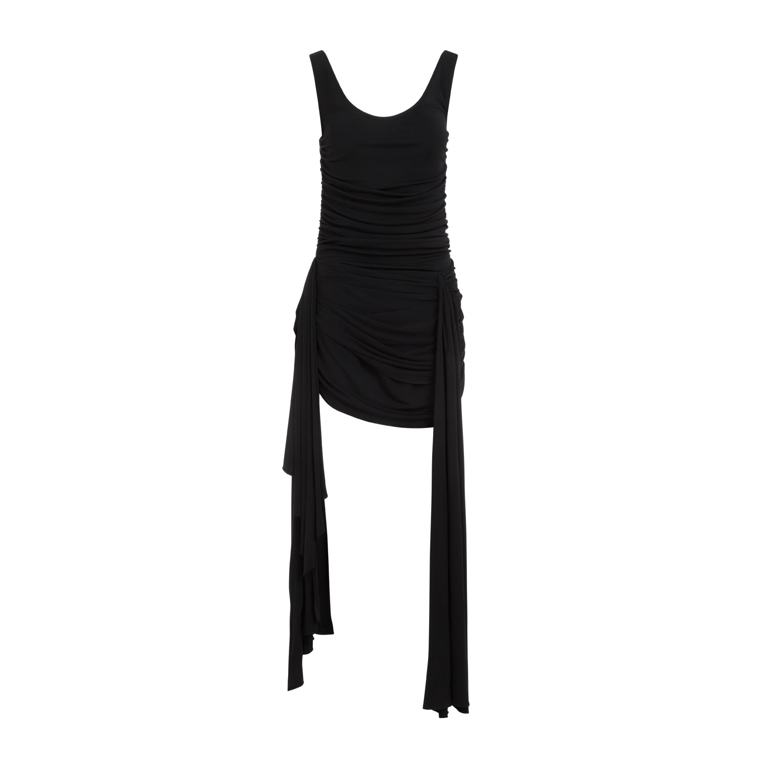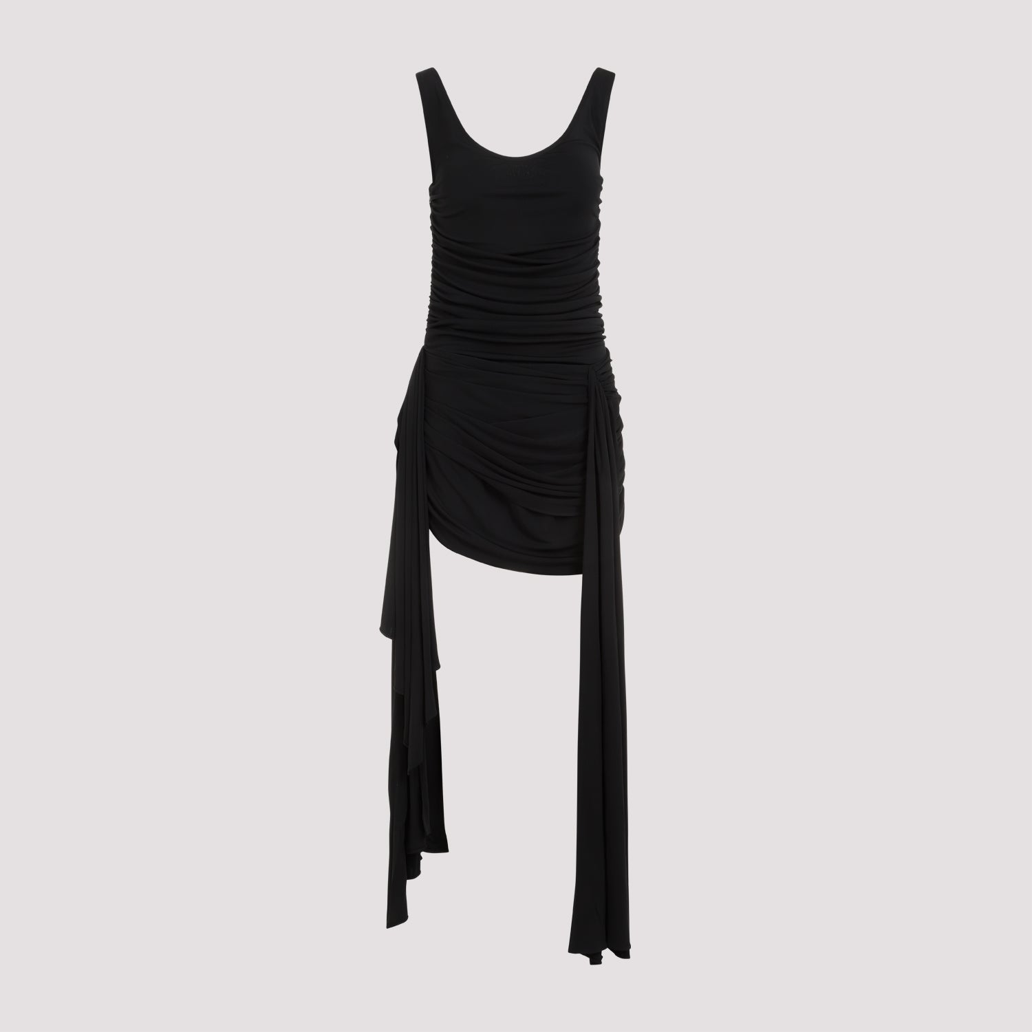 Mugler v. Crafted in viscose and polyamide blend. Round neck, gathered effect all-over, sleeveless, asymmetric hem, side draped details.