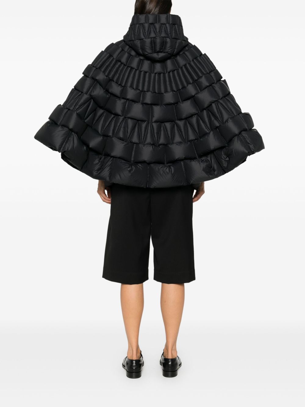 black goose down padded design 3D basket weave front two-way zip fastening classic hood cape design two side zip-fastening pockets full lining curved hem
