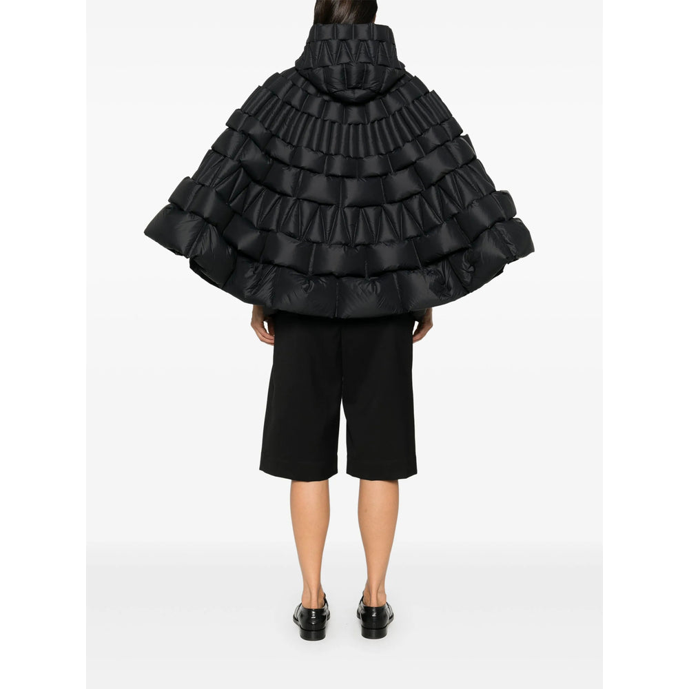 black goose down padded design 3D basket weave front two-way zip fastening classic hood cape design two side zip-fastening pockets full lining curved hem