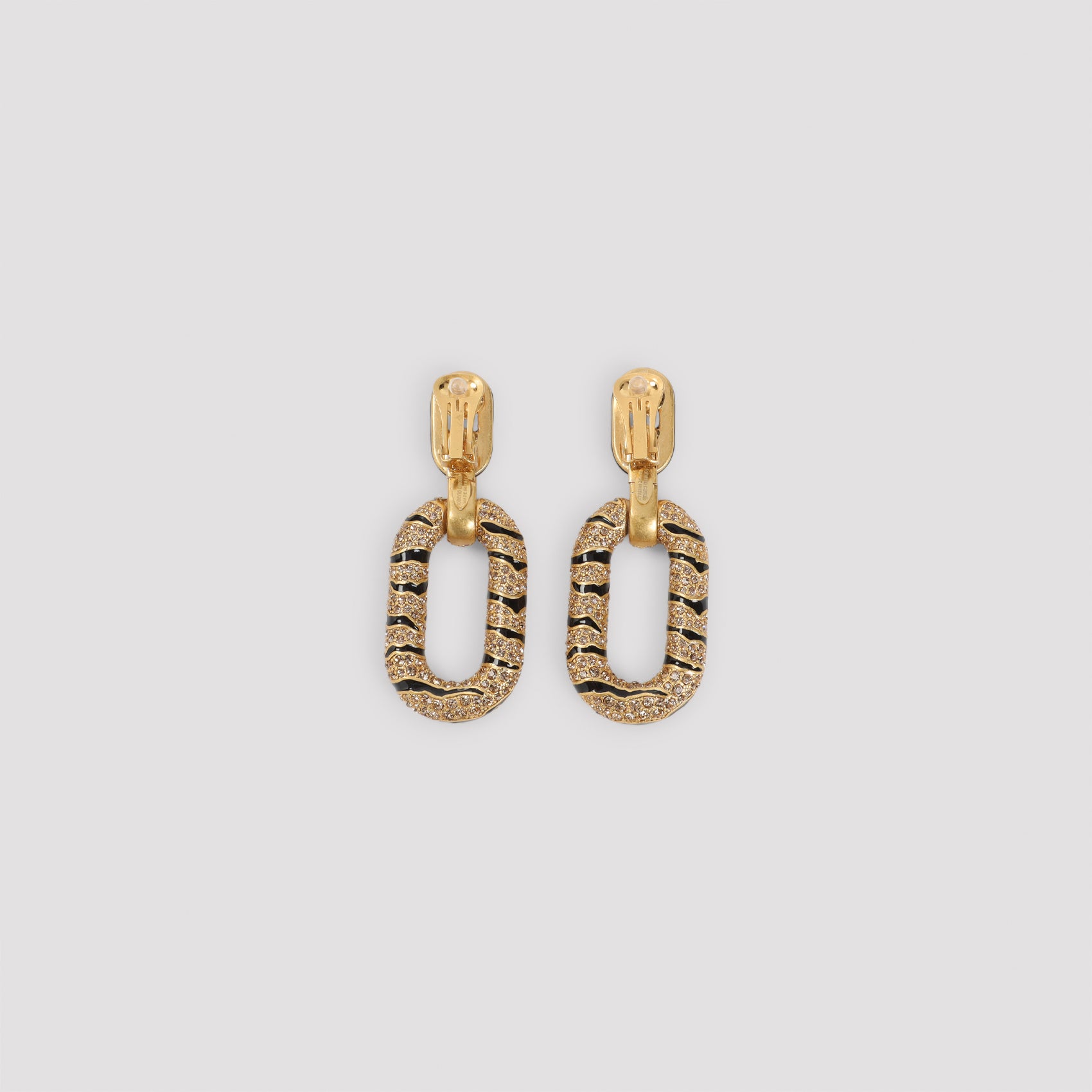 Roberto Cavalli Roar Golden Aluminium Earrings. Crafted from gold-toned aluminium, pendant design, zebra pattern, black enameled details, crystal embellishments, clip-on fastening.