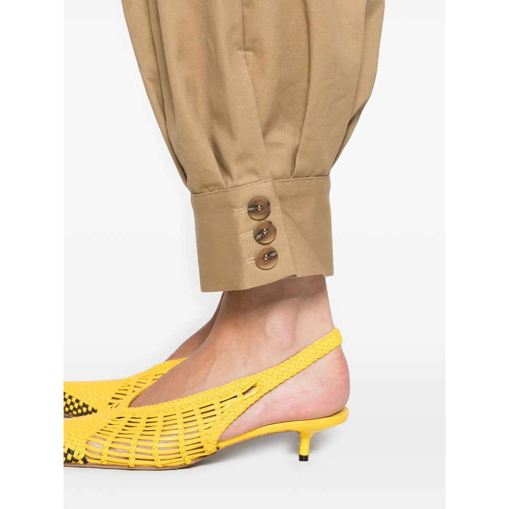 camel brown concealed fly and button fastening two side slash pockets two rear jetted pockets pleat detailing