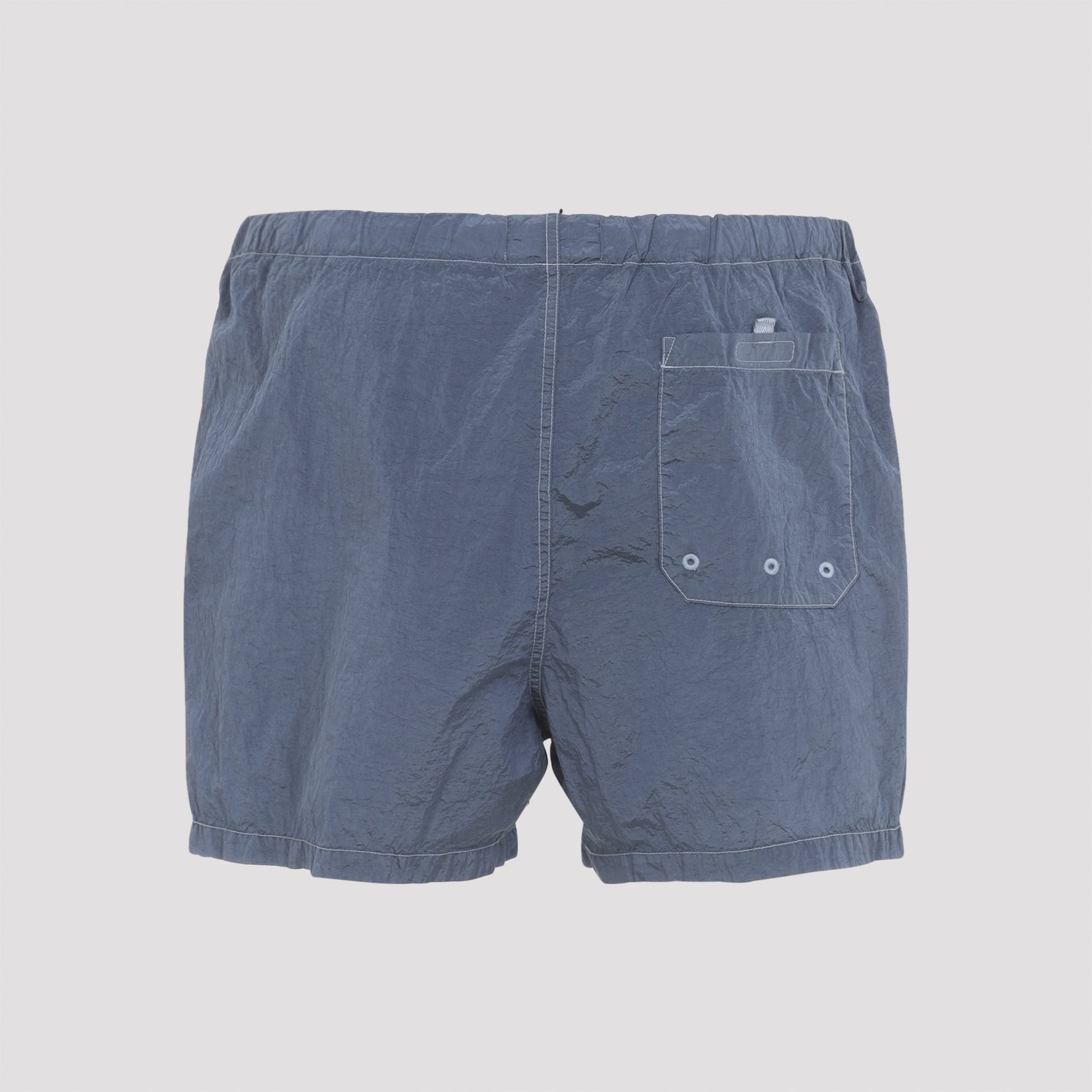 Stone Island Dark blue Polyamide Shorts. Dark blue tech fabric, elastic waistband and drawstring, front button fastening, side pockets, front logo patch detail, pocket on the back, straight hem.