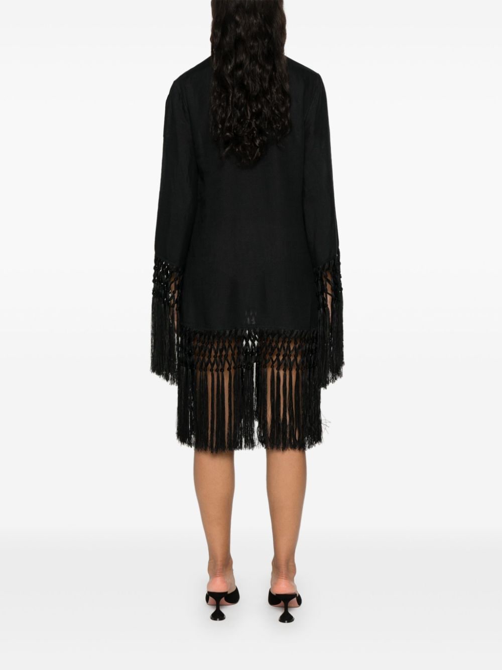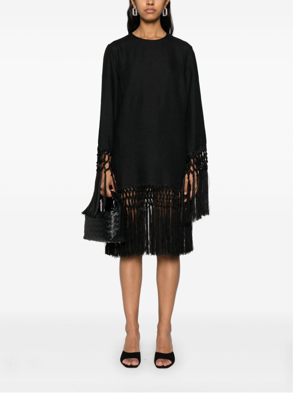 black linen/flax shift style round neck long sleeves fringed edge fringed hem keyhole detail to the rear unlined single rear button fastening This item contains at least 50% materials which are certified or widely recognised as having a lower environmental impact through production and/or manufacturing processes that reduce water consumption and the use of harmful chemicals, or re-use by-products of the production process. Learn more about what makes a product Conscious on our Conscious Criteria page
