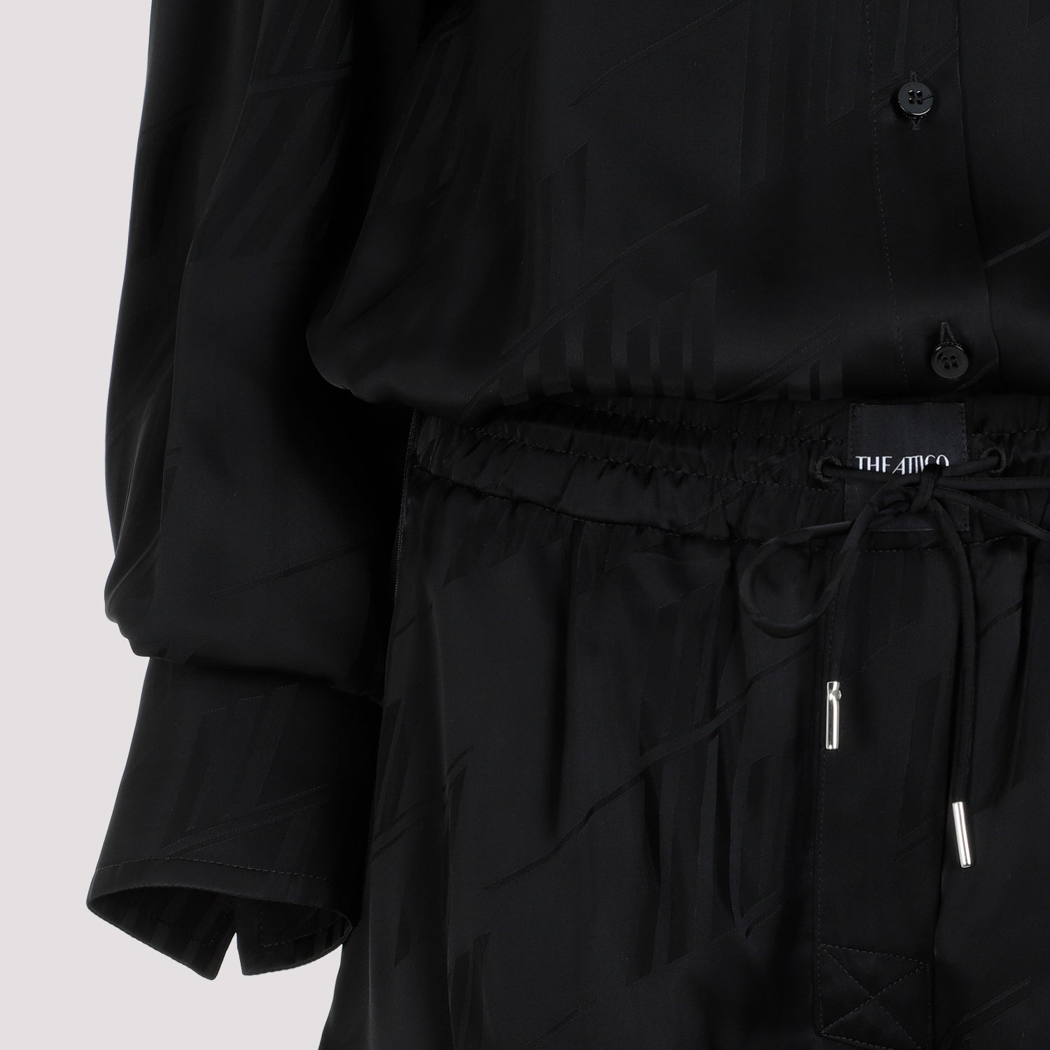 The Attico Overall Black Viscose Jumpsuit. Crafted in black satin, tonal logo pattern all over, pointed collar, front button closure, long sleeves with cuffs, elasticated waist with drawstring and branded label, loose fit pants with elasticated edges.