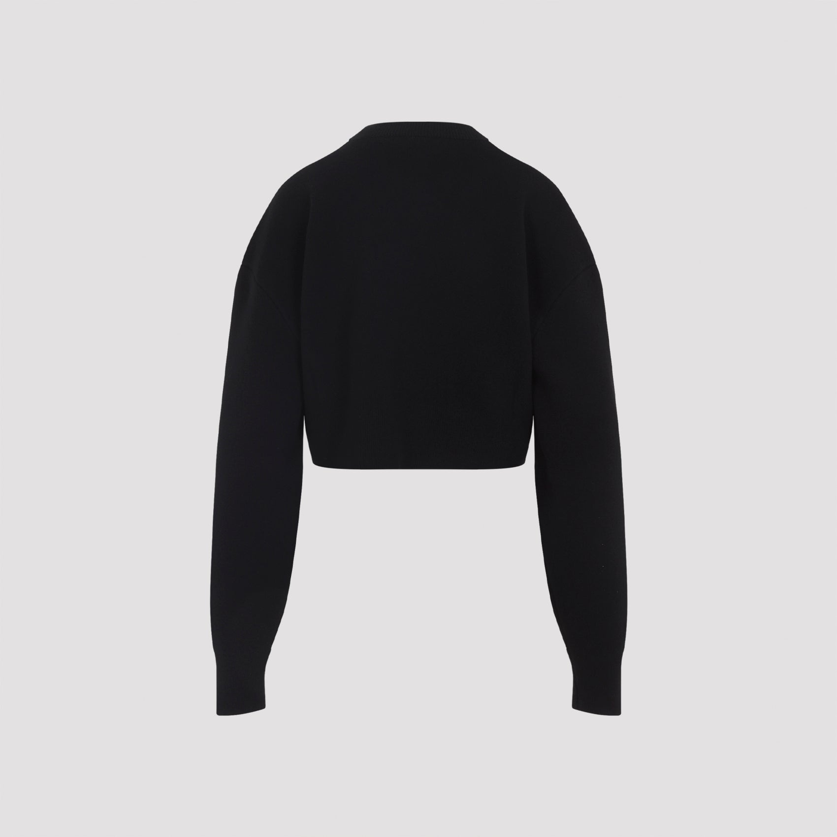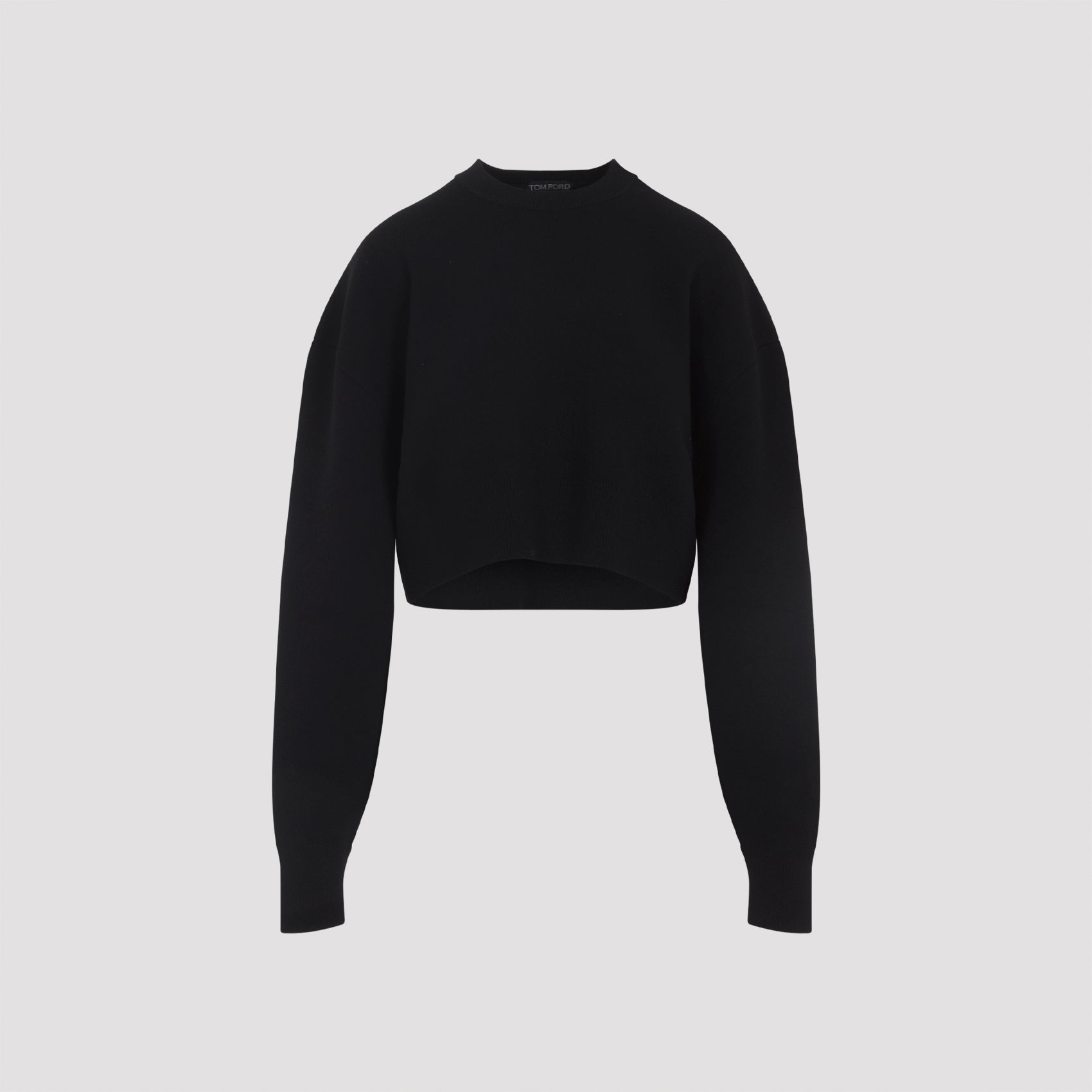 Tom Ford Black Virgin Wool Knit Top. Crafted in virgin wool, cashmere, polyamide and elastane blend. Round neck, dropped shoulders, long sleeves, ribbed cuffs, asymmetric hem, cropped design.
