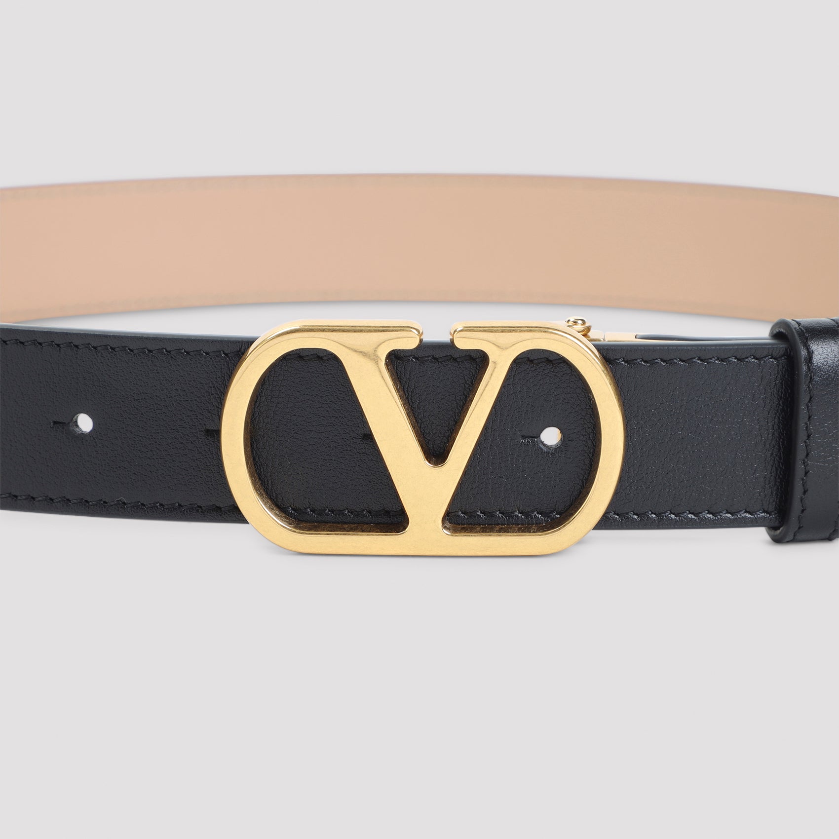 Valentino Garavani H30 Reversible Black and Rose Sand Calf Leather Belt. Reversible belt crafted from calf leather, featuring one black side and one rose sand side. Gold-toned metal Vlogo buckle, two leather belt loops, adjustable fit.