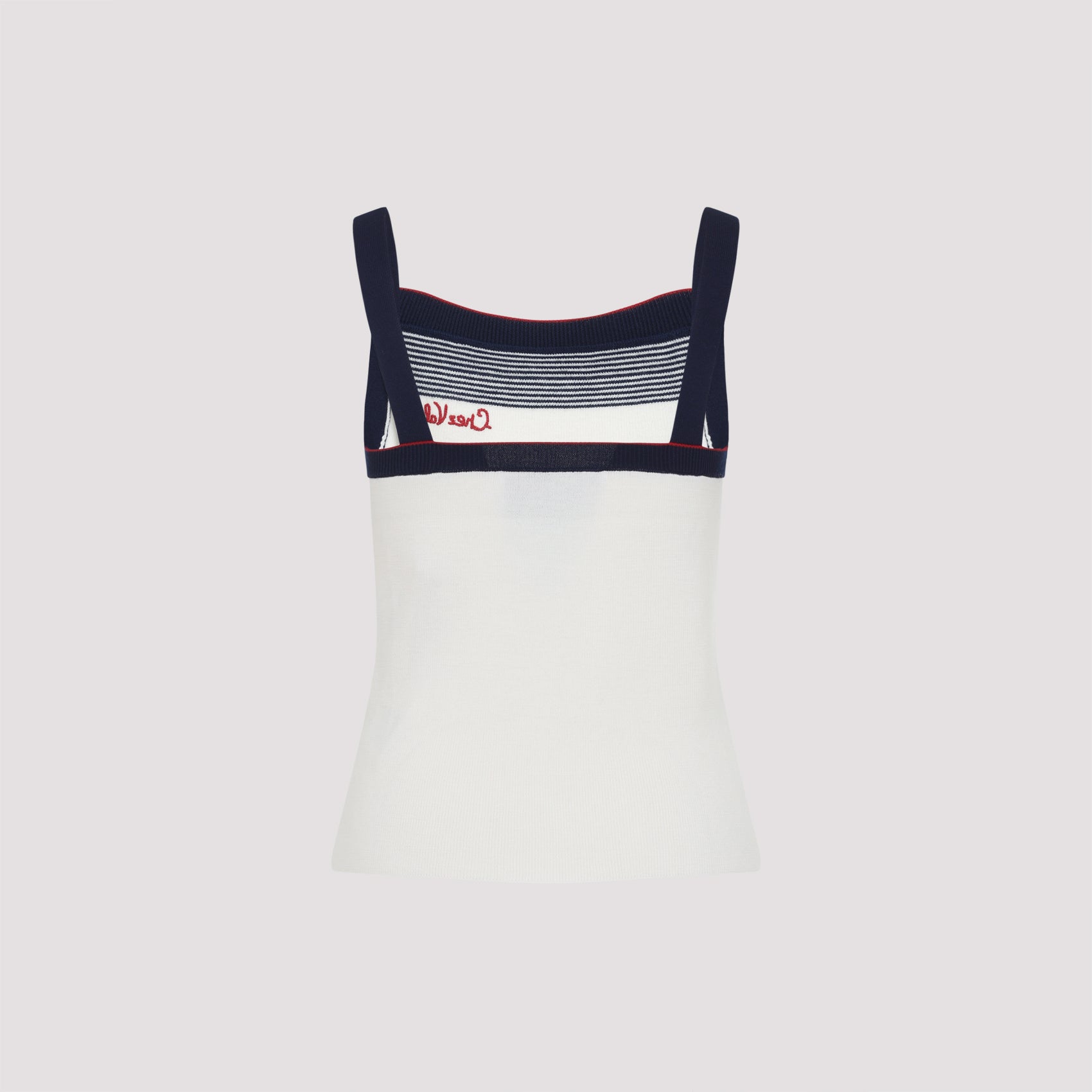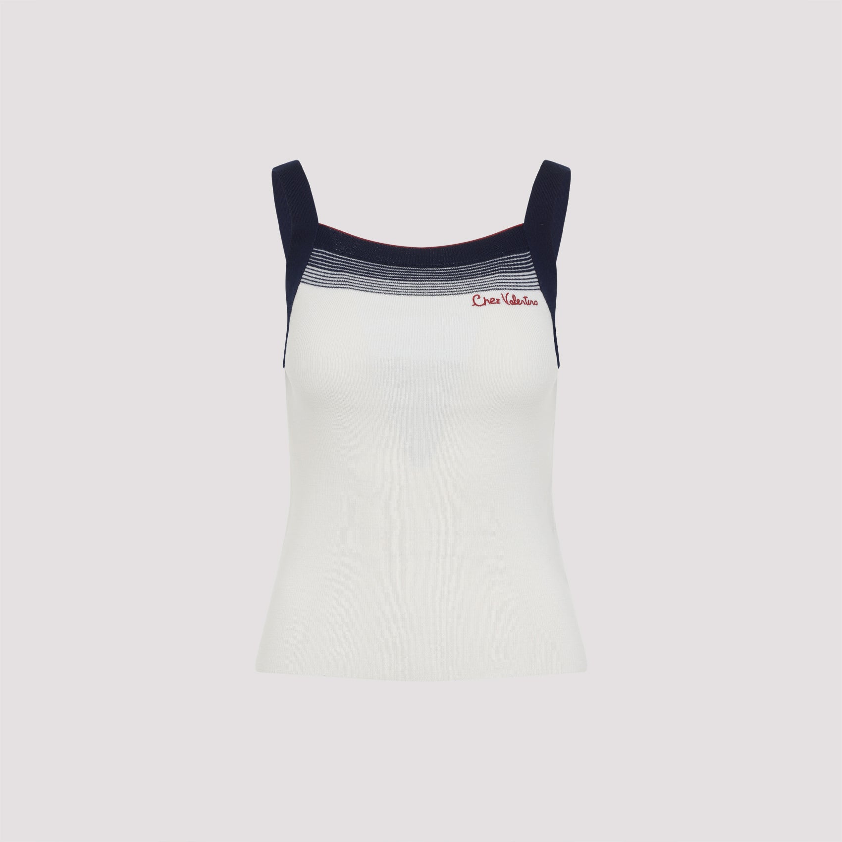 Valentino Betulla White Virgin Wool Top. Pure virgin wool top, thin shoulder strap, squared neck, side contrasting red embroidered "Chez Valentino" logo, sleeveless, straight hem, knitted design, navy-blue details on the top.